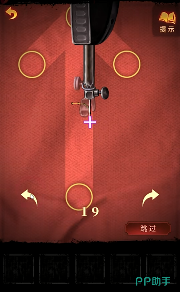 回缝纫室之后,把摇把放在红色盒子上,然后根据盒子里面给出的信息来快速调整木偶的姿势,获得面具之后,回到密室里面找到神龛,把马鞭、磨刀石、小面具放进去就可以得到一根针,然后回到缝纫机前使用针和线团、盖头就可以进行箭头缝制,然后将有箭头的红布放在安全出口上面就可以成功打开另外一间房门。