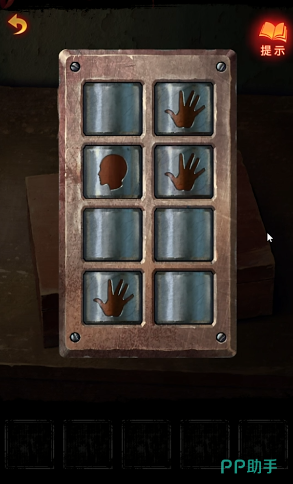 回到外面,把照片挂在墙壁上面,然后到左边的墙壁下面找到通风口使用书签打开通风口的栅栏,使用小陶俑让它自己进去可以得到一颗玻璃珠,回到刚刚出来的门口就可以将假眼睛和玻璃珠放进门口的脸谱面具里面,就可以获得一个门把手了,使用门把手打开门进入房间内进行探索,然后触发剧情进行谈话,发现同行好友是木偶人,根据场景内的线索解开木盒上的密码,从左往右,从上往下分别是:空白、头、空白、手、手、手、空白、空白。