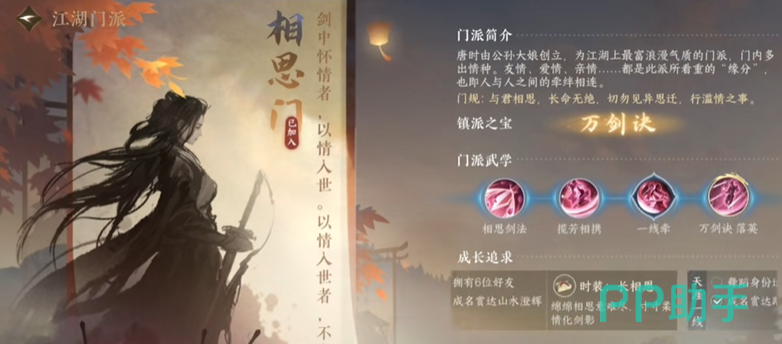 除了龙门客栈之外,游戏中最受欢迎的江湖门派就是相思门了,很多零氪玩家都很喜欢这个门派的服装,而且技能强度也非常的不错,玩家们可以获得三个技能,同时解锁办法也比较基础,在达成【丹虹开岐】获得【月下红线】之后就可以学习揽芳想携技能了,舞蹈身份达到6级就可以获得一线牵动技能,这个技能在与情缘玩家们一起挑战的时候会变成技能,但是单人的话效果没有那么好!
