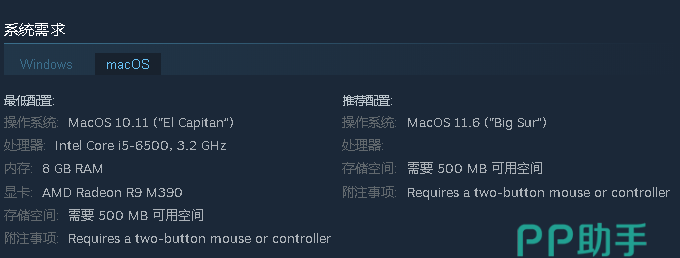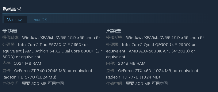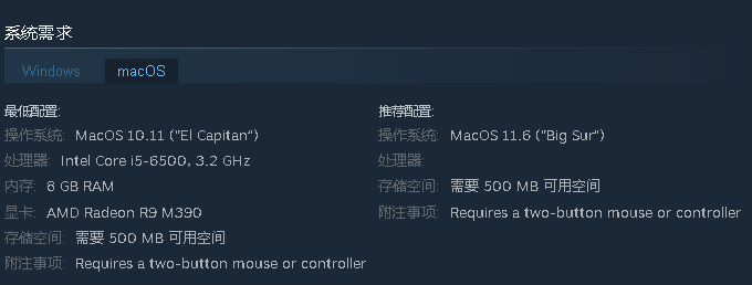 另外在苹果的macOS系统上也能玩起来,仅仅需要10.11版本以上,这个处理器也已经是过时的型号了,所以如果你的机器只要不是老旧的过于离谱也能带的动,不吃设备性能也让该作一直可以保持畅销,并且仅仅需要58元人民币就能买下来非常便宜。