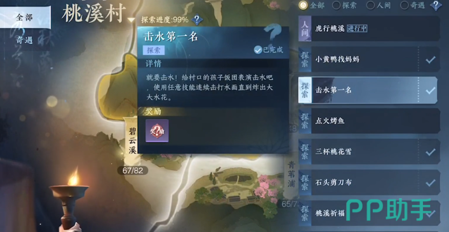 这个击水第一名的任务其实是跟技能有关的,触发的地点在桃溪村,也算是一个奇遇任务,等级是小吉,探索到桃溪村的时候大家就可以在(939,1180)的地点去找到具体的任务地点,到达这个地点之后大家要是看到的是一片水面就找对位置了。