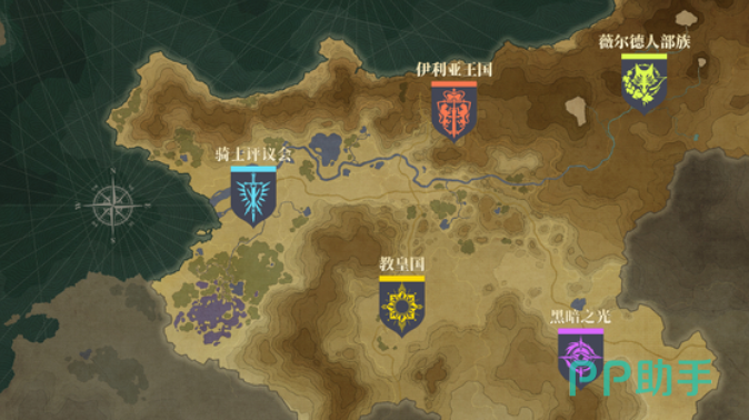在伊利亚周边分布着四个国家,分别是骑士评议会、黑暗之光、教皇国和微尔德人部落,这四个事例会在游戏中互相争夺,因为在游戏中有很多剧情和支线的设定,不同的选择也会导致各个国家势力的不同,所以玩家每一次的选择和战斗决定着整个游戏局势的变化,玩家可以根据这种变化及时的调整战略战术,保证其他势力的均衡。