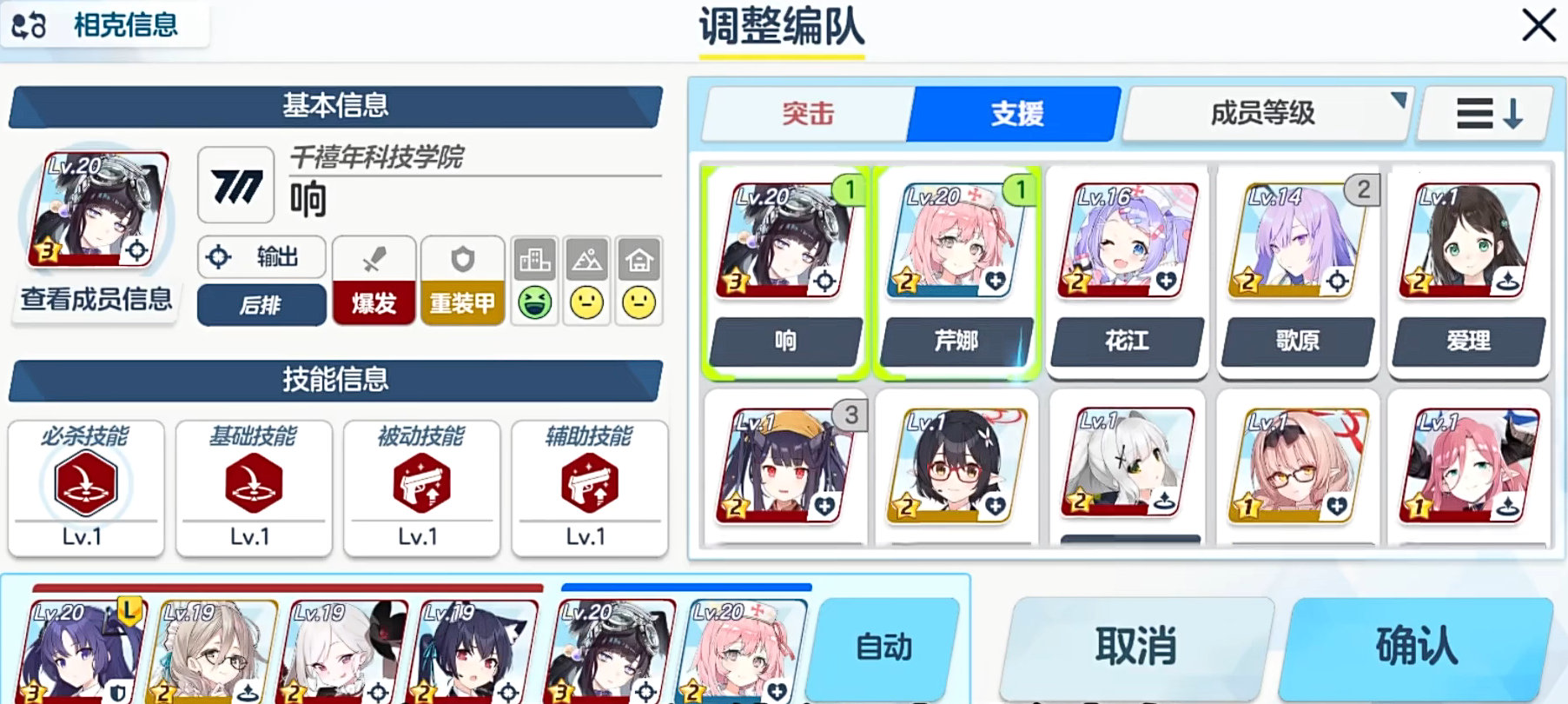 队伍组成有优香、朱音、睦月、芹香组成的前排加上响以及芹娜的后排组合。基本上除了想这个三星输出以外,剩下的所有角色都是两星或一星级别的角色,特别容易抽到基本上,每个玩家们都可以轻松获得。基本上每个玩家们在前期两次十连,包括新手送的十连当中都有极大的概率直接凑齐整个队伍。