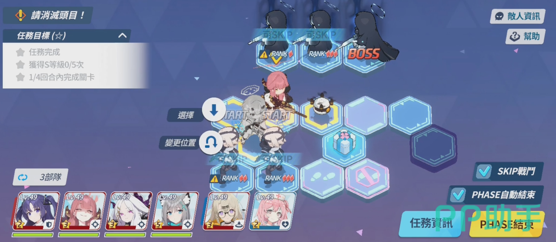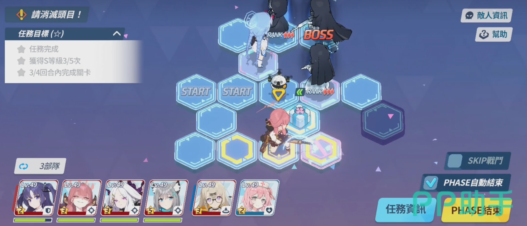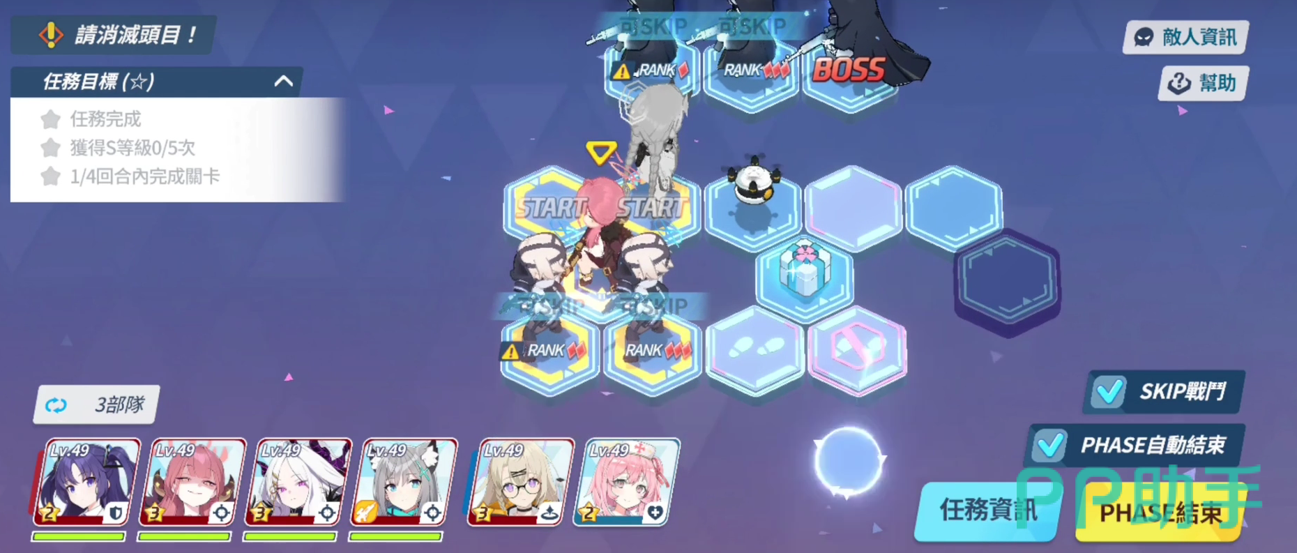 任务12-2困难关卡的任务目标,需要我们在完成任务的同时赢得至少5次s等级的任务评价以及4回内完成任务。敌人总共有五名配置,因此对于玩家们的队伍走位和角色使用就十分的关键。