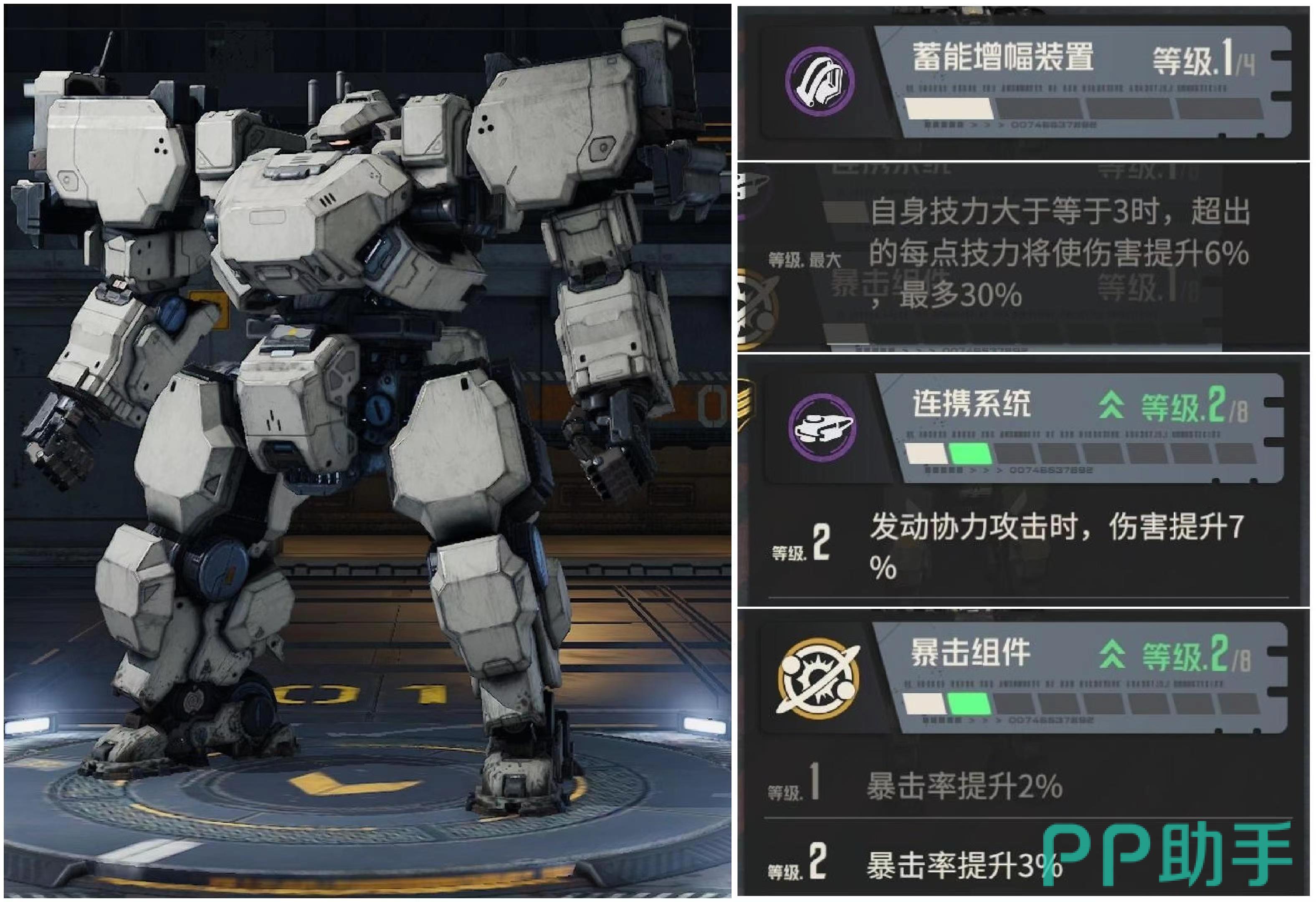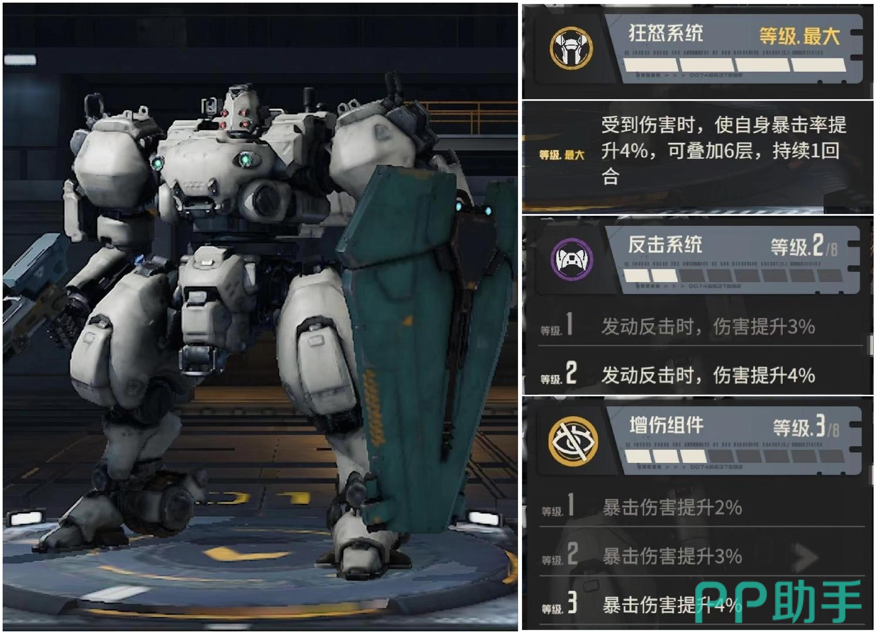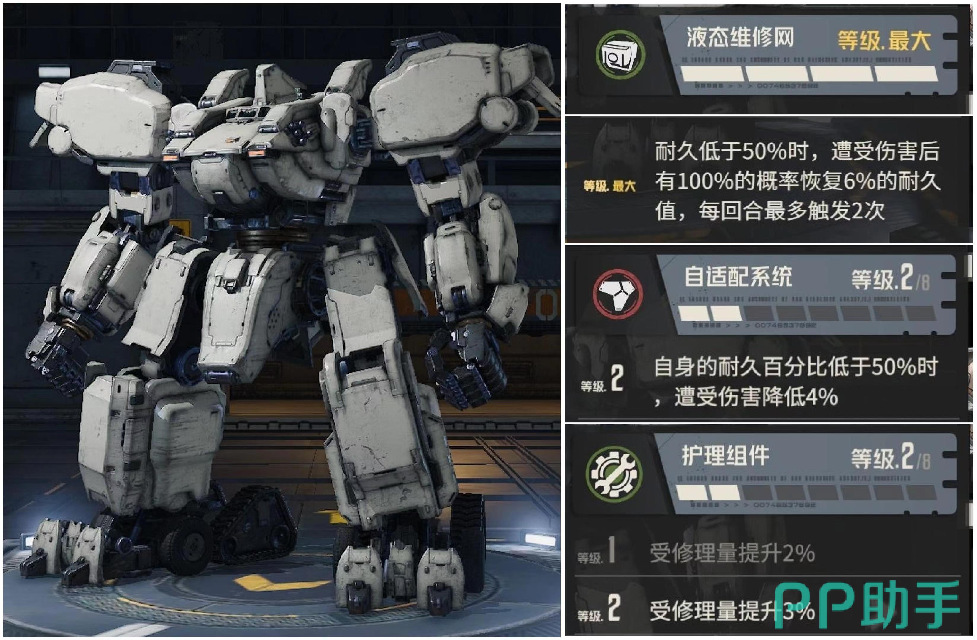戴亚斯拥有的是狂怒系统,反击系统和增伤组件,狂怒系统起到的作用是受到伤害时,自身暴击率就能提高,最多能叠加到6层,持续一回合。所以上前去先承受一波伤害,回来带输出将有更好效果,反击系统使其在发动反击时伤害能得到提升,增伤组件提高的是暴击伤害。吉尔莱斯拥有液态维修网,自适配系统和护理组件。液态维修网使其耐久低于50%时,一旦再次受到伤害就有极高概率恢复自身耐久值,每回合最多触发两次,所以低血量不用害怕。自适配系统使自身耐久百分比低于50%遭受到伤害降低,护理组件使受修理量提升。