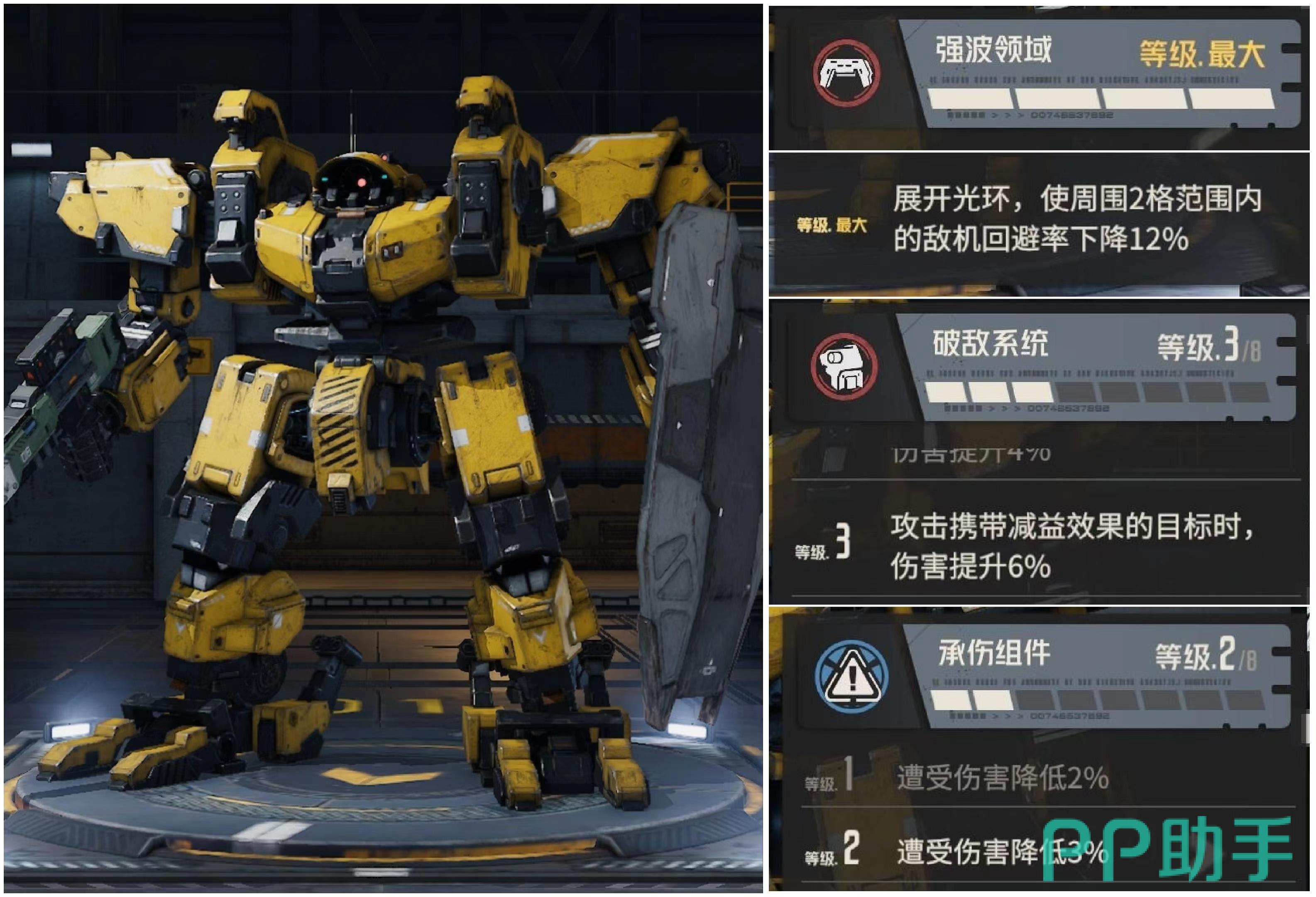 赫拉克勒斯拥有强波领域、破敌系统和承伤组件,强波领域能展开光环,使自身周围两格范围内敌方机甲回避率下降,降低回避率以后也就相当于对方将会更难闪避开攻击。破敌系统使攻击携带不良效果的目标时伤害有所提升,最后承伤组件降低遭受到的伤害。