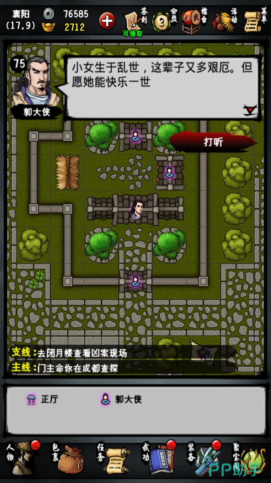 1.玩家先去郭大侠那里打听八卦门的事情,随后去八卦门掌门人处询问,掌门问我们有没有兴趣做八卦门掌门人,这里一定要选答应,不然任务没了。