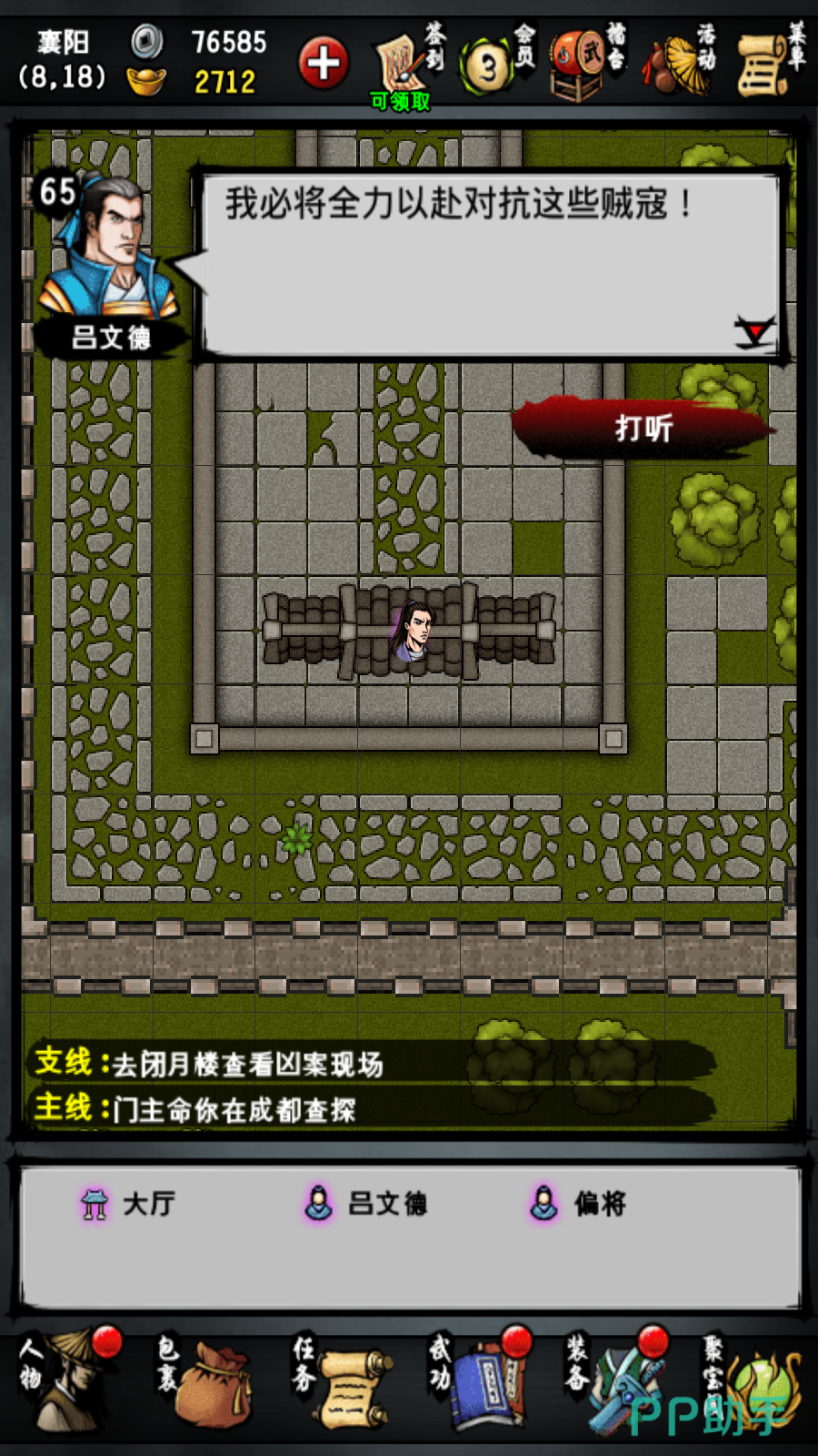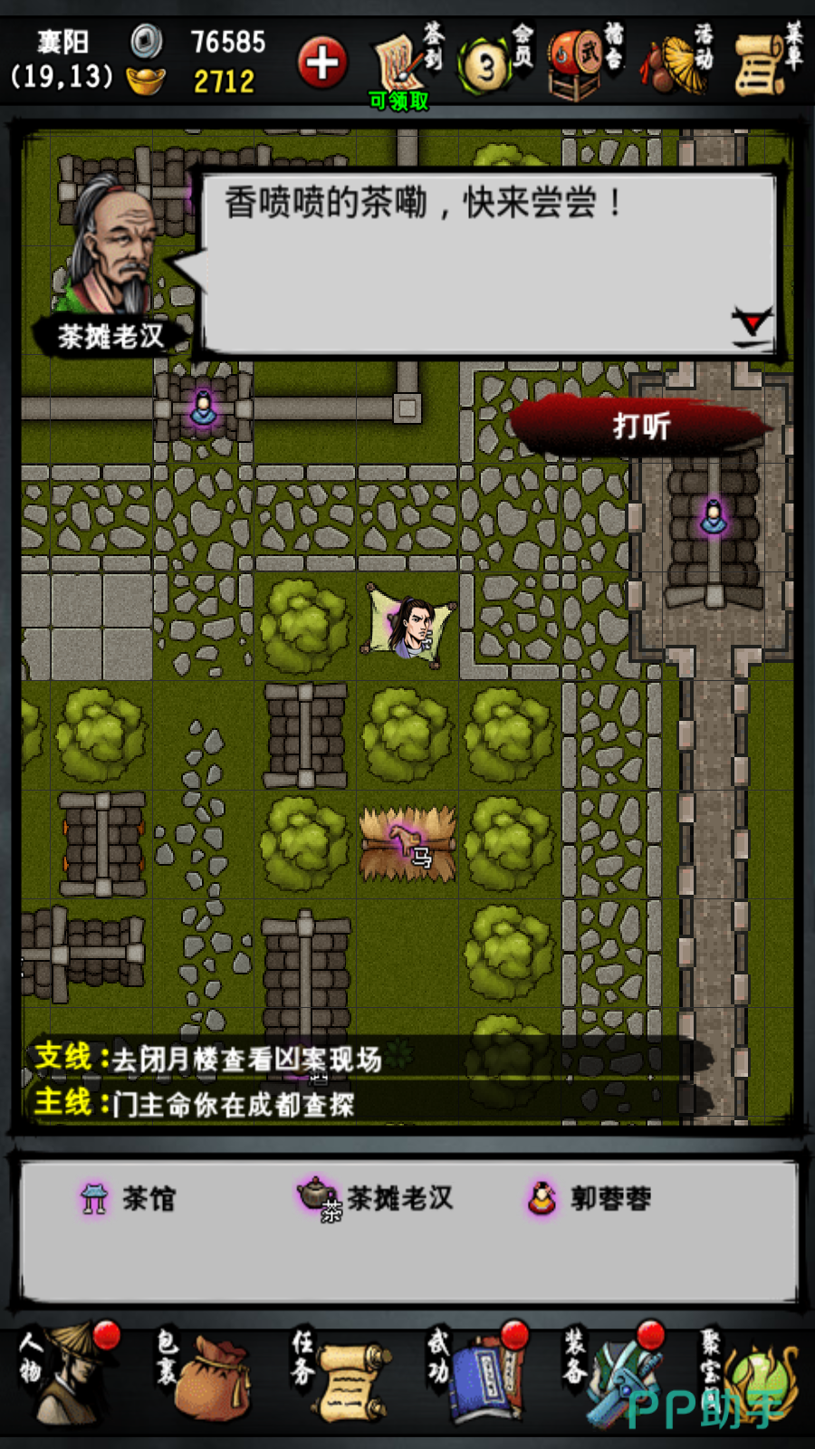 1.去襄阳城的左下角找吕文德聊天得知有间谍进入了城内,答应帮他寻找,去茶摊找老板打听可疑人员得知最近有一个人一直在打听将军府在哪。