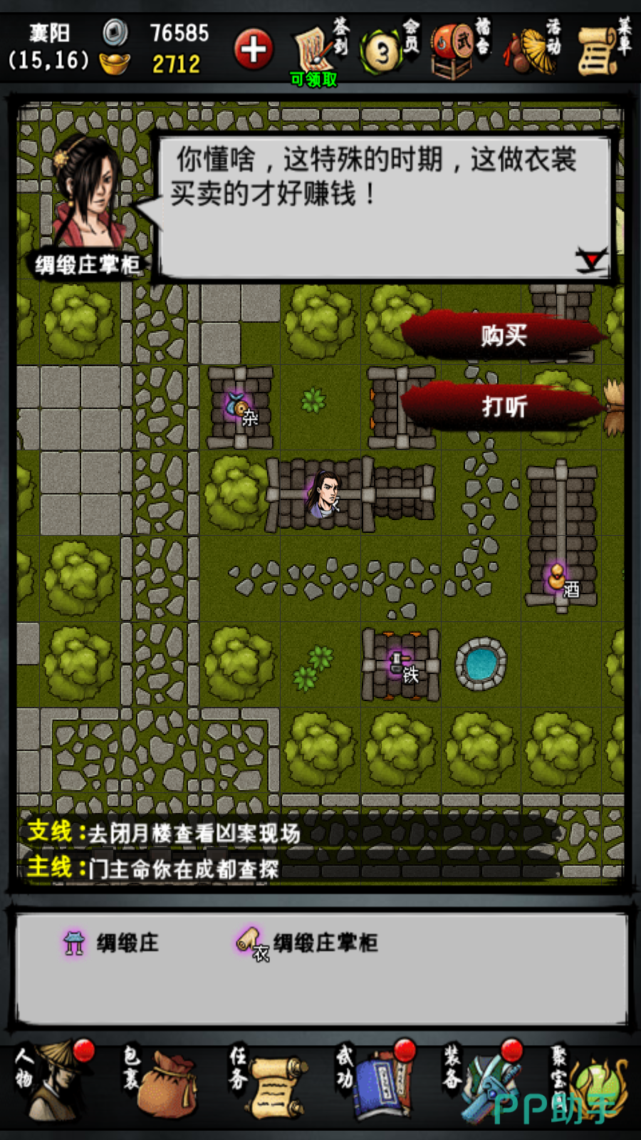 2.之后去将军府上方的八卦门找掌门人打听间谍得知在闹市附近有可疑人员,随后来到绸缎庄找老板打听间谍,最后去找马夫打听的时候听到马概里有异响,搜索马概找到间谍。