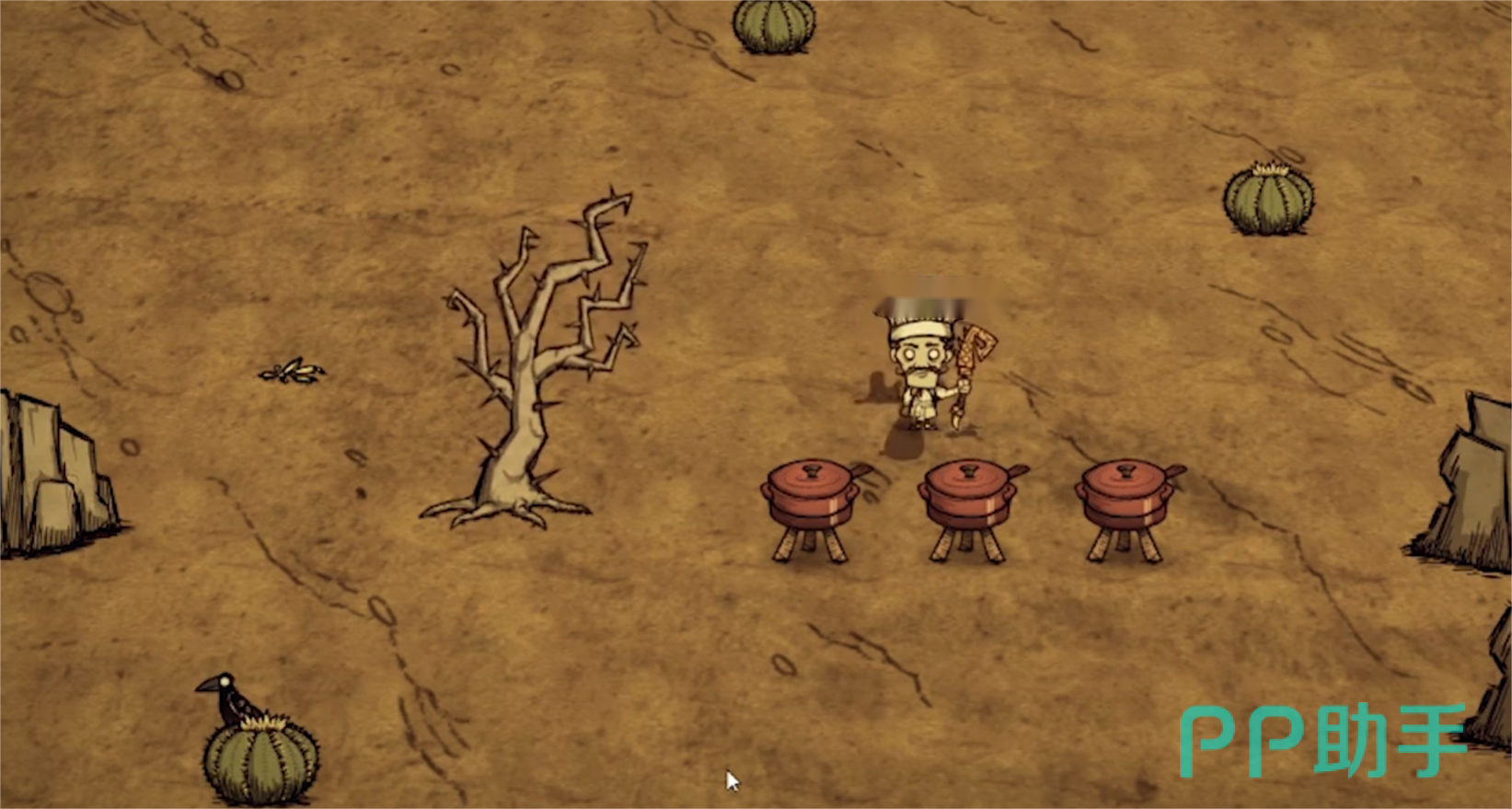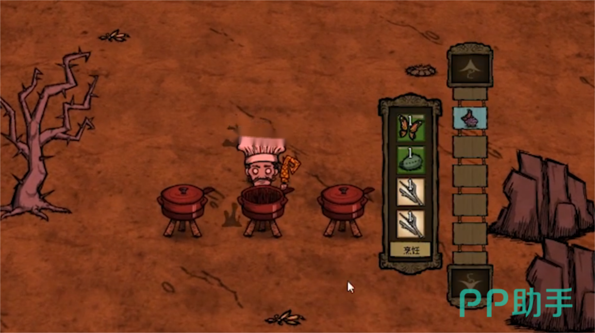 大家准备好自己的锅子,在锅子里面放入仙人掌,之后按照图中所示放入树枝和蝴蝶等等素材,然后等待一段时间之后就能获取烤仙人掌了,这个食谱的作用就是用来回复脑残值,在游戏的前期是非常重要的食物。