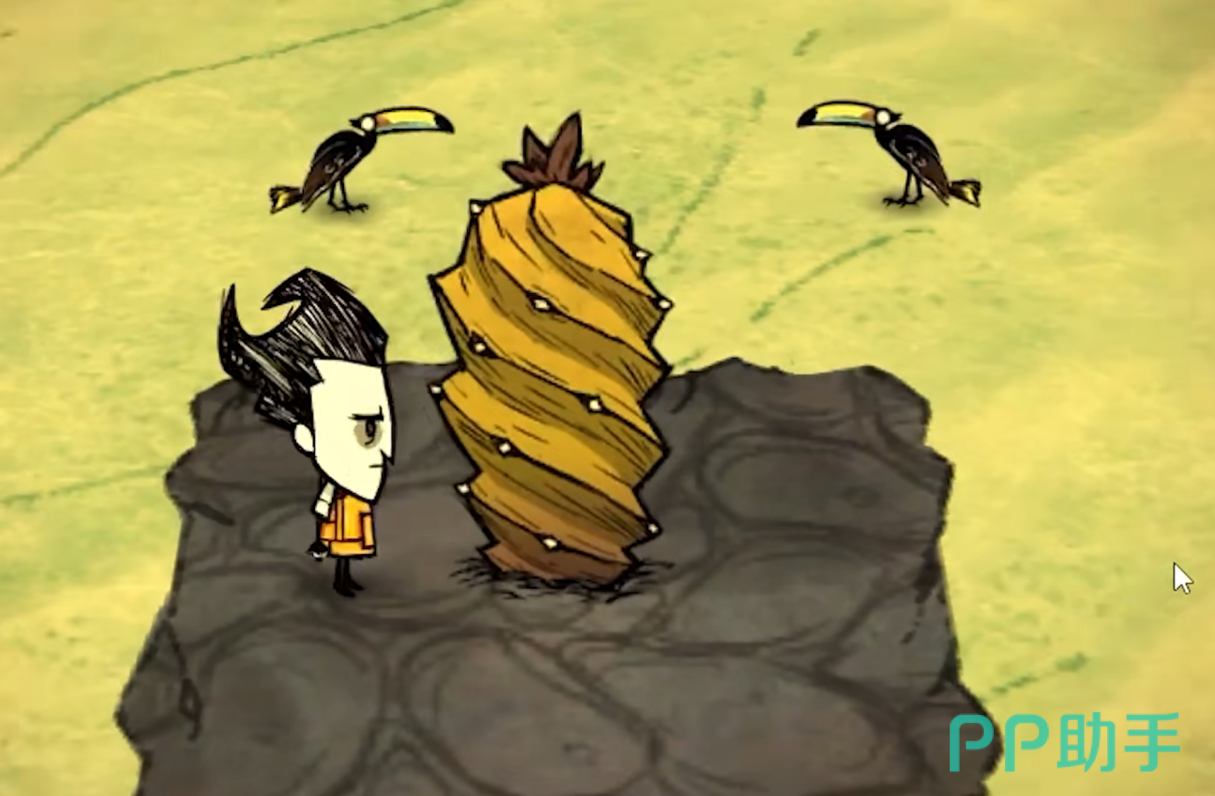 首先需要找到一个仙人掌,注意不要找这个黄色的仙人掌,这个仙人掌会攻击靠近的玩家,属于前期比较棘手的存在,但是玩家可以用它制作长矛以及盔甲,大家要砸后下图的绿色仙人掌,但是没有工具采摘的话是会掉落血量的,不过需要的话还是要做出牺牲的。