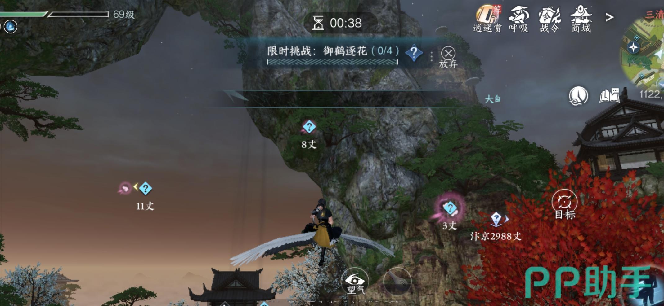 这类谜团很容易便被玩家发现,若玩家发现路边有着一只白鹤,靠近后选择骑乘,便会触发这一限时挑战,玩家只需根据系统的指引,骑着鹤去一一触碰空中花,便可完成这一挑战获取宝箱奖励。