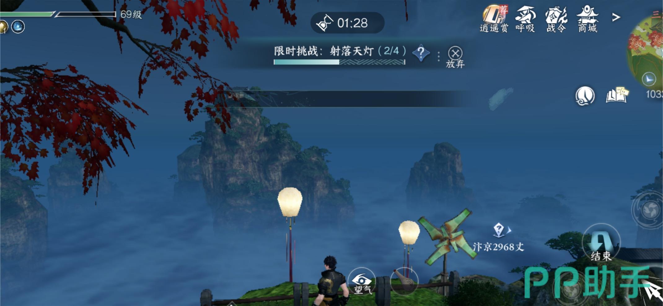 触发方式与上文一样,但是挑战方式却大相径庭,但也十分简单。挑战触发后,玩家的普通攻击将被替换为射击,通过瞄准面前的天灯,将其全部射落,便可以获取宝箱奖励。