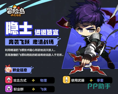 第二个角色是冒险家阵营中的【隐士】,隐士很擅长远距离作战,使用的武器是卷套,会像敌人投掷出大量的飞镖,攻击带有刺客标记的敌人时,周围会迸发出飞镖,攻击附近的敌人。这个角色在游戏中是属于物理攻击的,职业群体是【飞侠】,会利用精湛的飞镖技术随心所欲地消灭敌人。这个角色的属性面板上来看输出和机动性是最高的,同时难度也是非常的大,主属性是【幸运】,副属性是【智力】,这就意味着在装备选择方面有了一个非常清晰的路线!