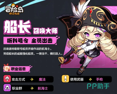 第一个排名的当然是我们的冒险家阵营中的【船长】角色啦,这个角色是一个召唤大师,在游戏中属于一个中距离攻击角色,使用的武器是一把短枪,攻击会造成魔法伤害,在游戏中的职业群体是航海士,主属性是【敏捷】,副属性是【力量】,在战斗属性图中可以看到这个角色的伤害和攻击范围是比较出色的,船长登顶的原因是因为它的快速技能【金属风暴】和通用技能【幸运骰子】可以帮助它带来更多的战斗收益!