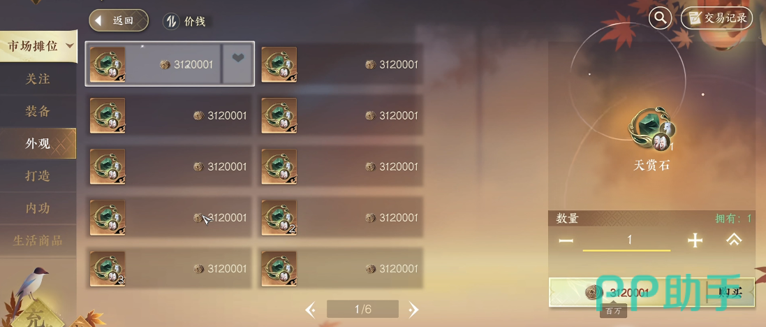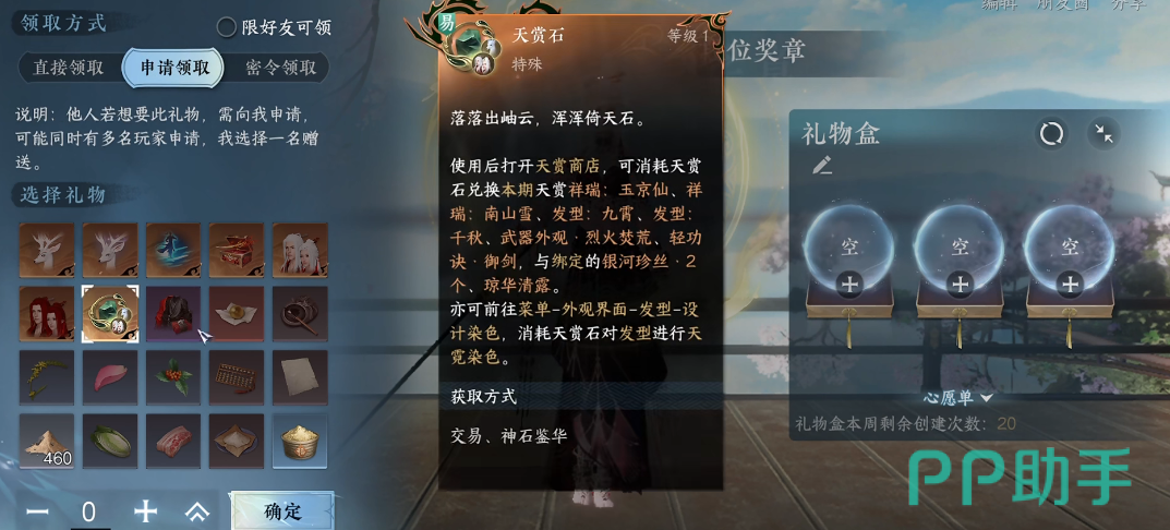 然后在补偿奖励以及活动赠送的礼品中也有机会出现,但是数量不多,而且也是看运气的,比较好获取的一个方式其实是去交易,大家可以关注一下商城中的特惠礼包,会经常出现一些珍惜物品,只要大家碰到的话,就可以购买下来,或者是去交易行中进行购买,选择靠谱渠道可以购买到天赏石。