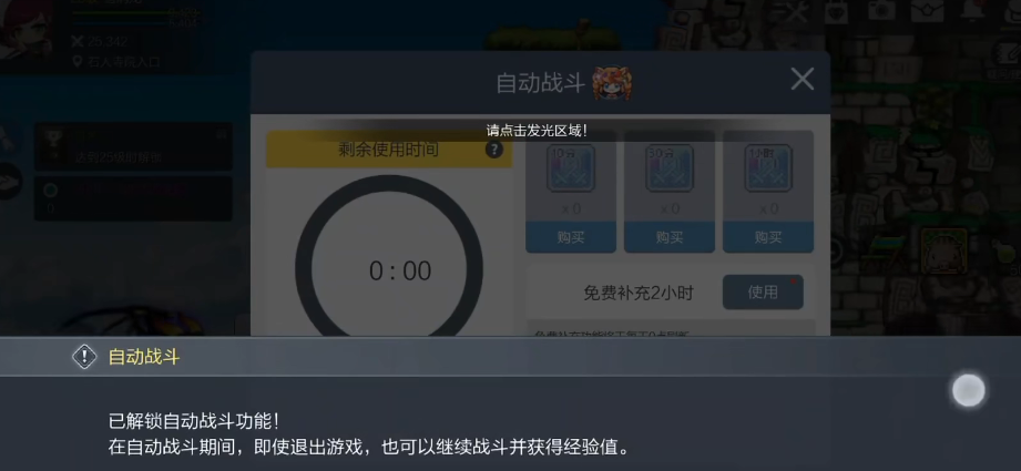 想要设置自动战斗的话,大家首先需要确定当天的挂机时间是否还有,因为挂机的设定这款游戏中确实有,但是因为刷怪给的经验还不少,所以为了避免大家持续练级,一天之内玩家只能自动战斗两个小时,也就是挂机两个小时,并不是可以一直使用的,如果超过两个小时之后大家就没有办法继续去挂机练级了。
