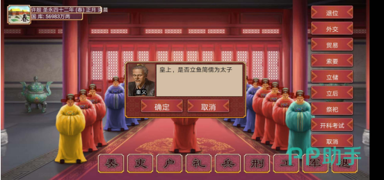 1、玩家随时都可以立太子,但是只能在上朝时进行操作。在朝中点击“礼”图标,右侧的选择中有个“立储”选项,点击该项功能就会跳出:是否设立XXX为太子的界面。确定无误后,点击确认即可成功立太子。