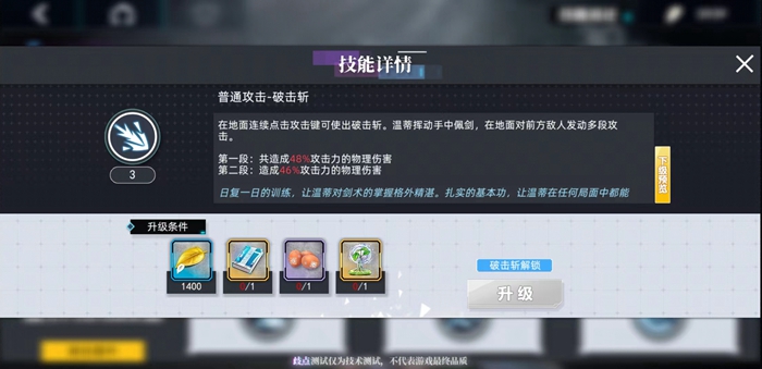 温蒂是一位身手敏捷、佩剑矫健的战士。她手持一柄华丽的佩剑,每一次挥舞都充满力量与优雅。普通攻击“破击斩”,通过在地面连续点击攻击键,她能在瞬间释放多段攻击,迅速削弱敌人的防线。第一段攻击造成48%攻击力的物理伤害,第二段攻击更是威力不凡,能够造成46%攻击力的物理伤害。