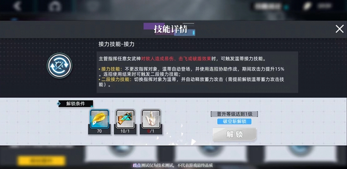 除此之外,温蒂的“接力技能-接力”。当其他女武神成功对敌人造成易伤、击飞或破盾效果时,温蒂能够触发接力技能。她会毫不犹豫地登场,与其他女武神进行默契的连招,大幅增强她们的战斗力。在接力技能期间,温蒂的攻击力将提升15%,让她成为团队的中坚力量。