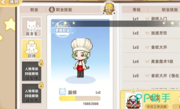 除了厨师和服务生这种相对比较基础的职业之外,还有两个需要玩家的游戏等级提升到20级,这就代表在这个时候已经拥有了完成游戏任务的能力,而且也对游戏的各方面设置都更加熟悉,这时候玩家就可以解锁建筑师和造型师,这两个职业要求玩家有独立的思想,并且有一定创造力,如果对这个职业职性质感兴趣的话,就可以来挑战一下。