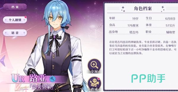 而且他的业务能力也极其优秀,甚至在咖啡厅打工时创下一个小时净赚数千金币的记录,因此又被称为金牌执事.他在游戏中的职业是辅助性,主要是给输出或者其他队友提供一定的帮助.