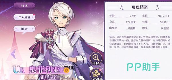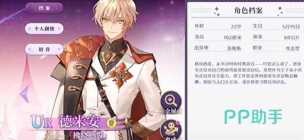 该角色是一个非常帅气的男性角色,有着金黄色的短发,黄色的眼睛,服装上更显非贵气,他在游戏中的品质是ur,也是最强的一个品质,他出生在洛维斯,是这个国家的王子,社交能力极强,职业为攻击,在战斗中的强度非常高。