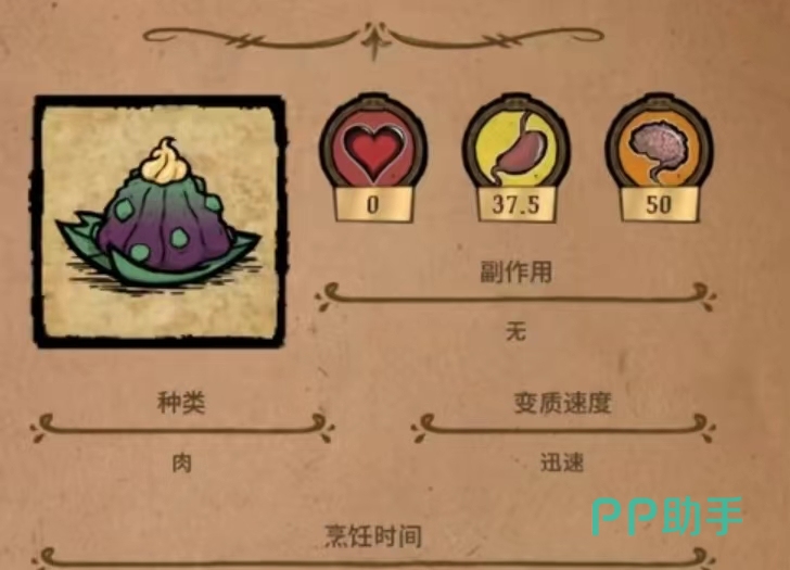 首先可以看到上图的料理的样子,很像杯子蛋糕的模样,只要食用之后就能加五十脑残值,比其他的料理强大数倍,并且配料也是异常的简单,只要叶肉就可以了,这个对于各位来说也是比较的简单的,大家在地上种植眼球草就能获取了,注意这个草会攻击各位,采摘的时候记得全副武装。