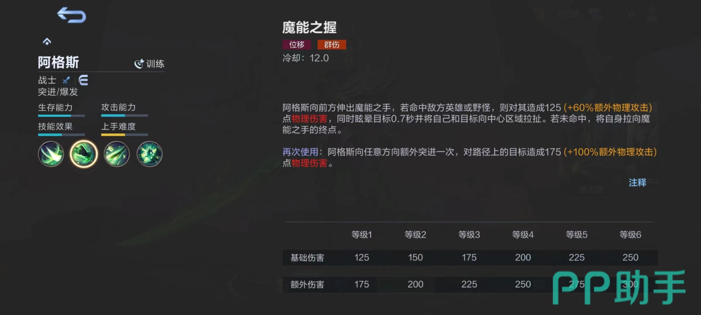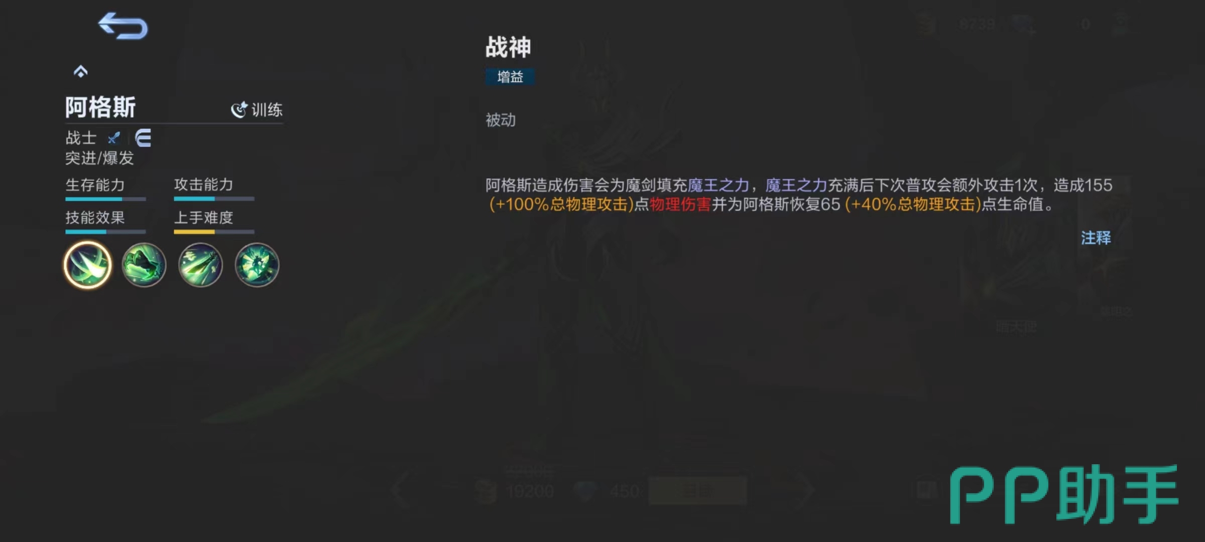 该角色是非常纯粹的战士,擅长突进和爆发,前期需要重点发育,有一定装备基础后才好使用技能。被动战神是增益类效果,阿格斯造成伤害后会为手中魔剑填充魔王之力,如果魔王之力充满,下一次普攻将会额外攻击一次,造成物理伤害并且为阿格斯恢复生命值。同样属于积累能量类型,这就要注意输出中节奏和状态,利用好额外普攻次数,这样可以在高层次对抗中给对方造成意想不到的伤害。
