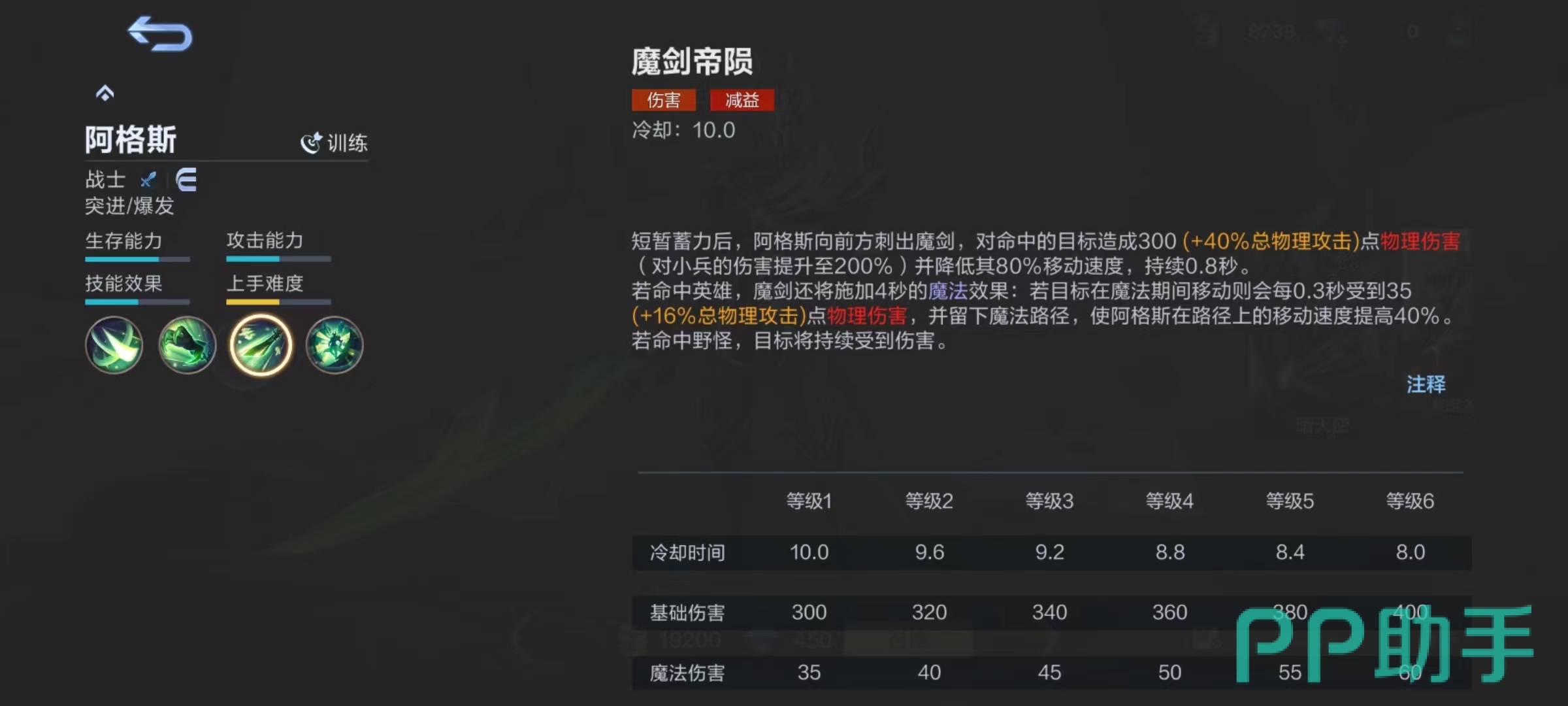 二技能魔剑帝陨,短暂蓄力后向前方刺出魔剑,命中目标造成物理伤害,对小兵伤害还有额外加成,并降低80%移动速度。如果命中敌方英雄,魔剑将施加4秒的魔法效果,目标在魔法持续期间移动将会受到持续伤害,并且留下魔法路径,阿格斯在路径上移动速度提升,如果命中野怪目标也将受到持续伤害。该技能的使用同样很讲究技巧。尤其是在单抓敌方目标时,添加上魔法效果后,对方无论是原地对砍或者是选择逃跑都非常难受,如果目标想要跑,有了移动速度加成的阿格斯,几乎能不费吹灰之力追上去。这样就逼迫对方,只能原地和阿格斯应硬拼,但对于拥有爆发技能的战士来说,大概率是拼不过的。