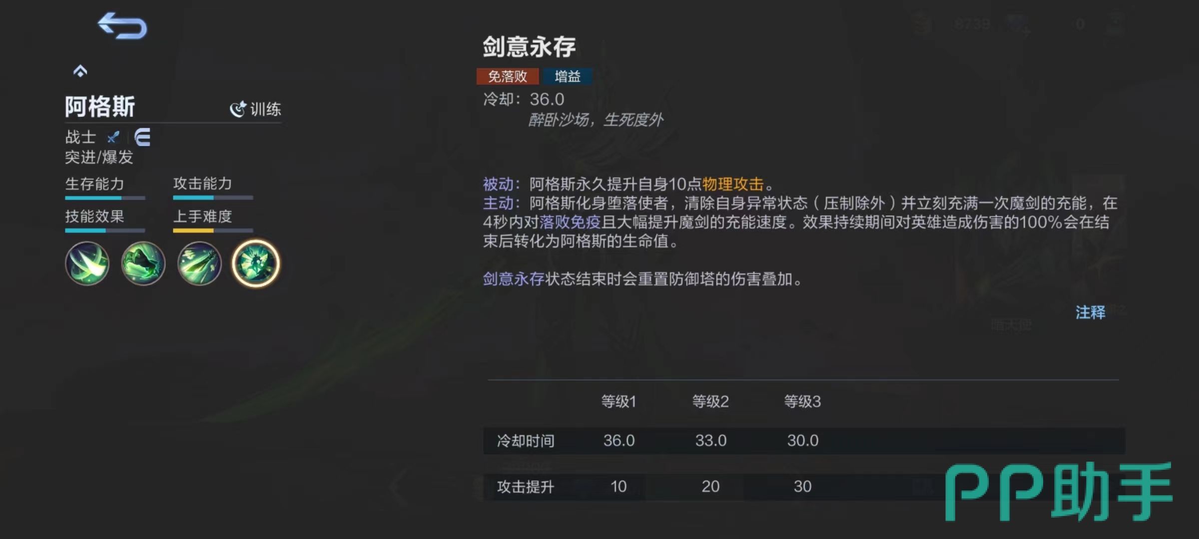 大招剑意永存,被动效果为永久提升阿格斯自身十点物理攻击,主动使用后化身为堕落使者,先将身上所有异常状态清除,并立刻将魔剑能量充满,在数秒内对落败免疫,并且大幅提升魔剑充能速度。效果持续期间对英雄造成的伤害会100%结束后转化为阿格斯自身生命值,状态结束时会重置防御塔伤害叠加。简单来说,大招开启后,将化身为狂暴型输出选手,无惧对方人数和输出,只需要疯狂甩技能就够了。