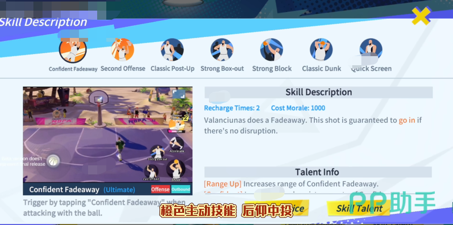 其他小技能则分别是“再来一次”,“传统背打”,“强力卡位”,“强力盖帽”,“任劳任怨”和“快速挡拆”,这些技能囊括了篮板能力,背身得分能力,以及防守和掩护能力,对于瓦兰丘纳斯是一个全面的提升,不过其最大特点还是能投篮,所以实战中更多被作为拉开空间的一个功能性中锋。