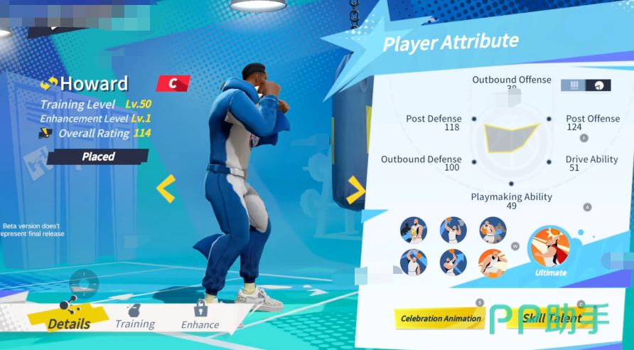 霍华德:它在内线进攻和内线防守上均有着顶尖的水平,当对方球员冲进内线时可以进行有效的干扰,同时其技能组合还显著增强了它的终结成功率,其中最具代表性更多就是主动技能“超人扣篮”,这一技能可以直接在罚球线位置起跳进行一次超远距离的扣篮,通过升级该技能的抗盖帽和命中率也都会增加,并且独特的充能机制,打到后面更是令其可以在扣篮失败后立即释放第二次技能。