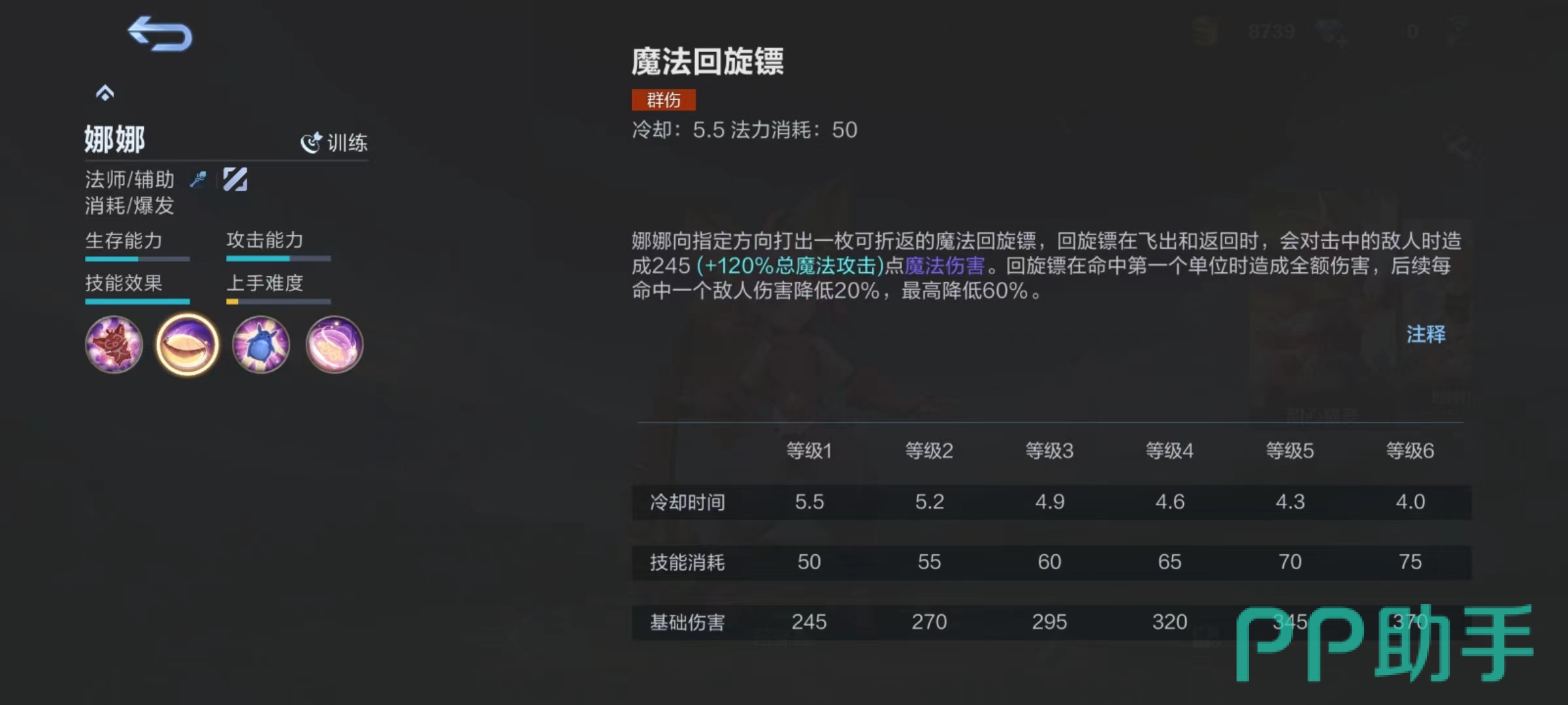 一技能魔法回旋镖,向指定位置打出回旋镖,在飞出和返回两个过程中都会对命中敌人造成伤害,但是如果命中多个目标,只有第1个伤害是全额,接下来都会有所降低。所以使用时候唯一技巧就是尽量让选定目标第1个承受,当然也可以在对线时用于清兵和耗血一块使用,这样可以攻击到躲在小怪后面的敌人。