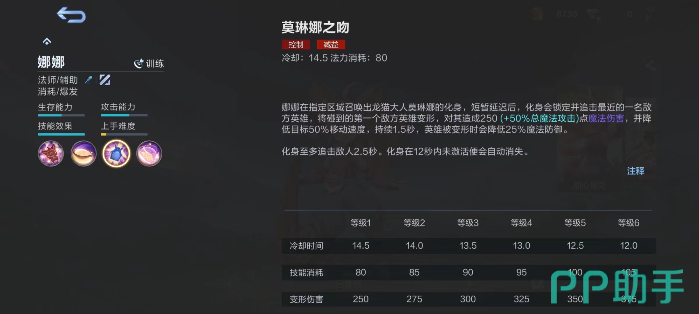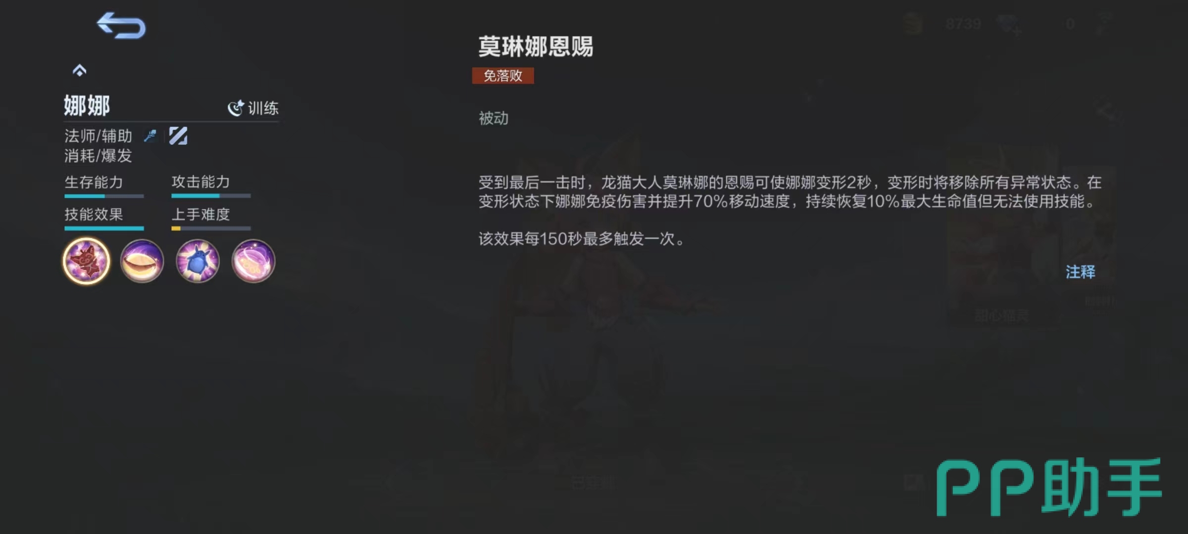 被动技能莫琳娜恩赐,受到最后一击时,莫琳娜恩赐可以使娜娜变形两秒钟,变形之后移除所有异常状态,在此状态下免疫伤害并且提升移动速度,持续恢复生命值,但无法使用任何技能。这也就相当于多了一条命,基本上在该技能冷却时间内,想要击杀掉娜娜是非常困难的,变形状态下完全有足够时间去逃生。这也是很多新手玩家非常喜欢的重要原因,会让自己的数据变得好看。