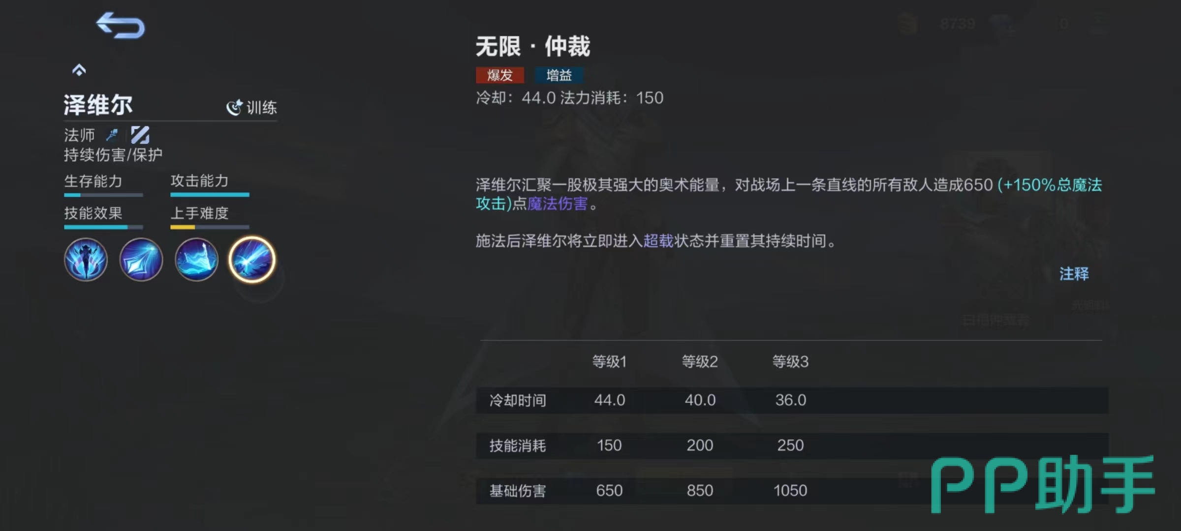 二技能的释放非常考验,操作一般来说是放到敌方多名玩家中间,这样可以起到分割整形的效果,也可以放到我方英雄追剧的路上,利用加速效果,更快追上目标,总之使用起来有很多不同的技巧将对战斗起到很关键的作用。大招无限仲裁,汇聚一股强大能量,伤害一条直线上所有敌人,施法后立即进入超载状态,并且将持续时间重置。