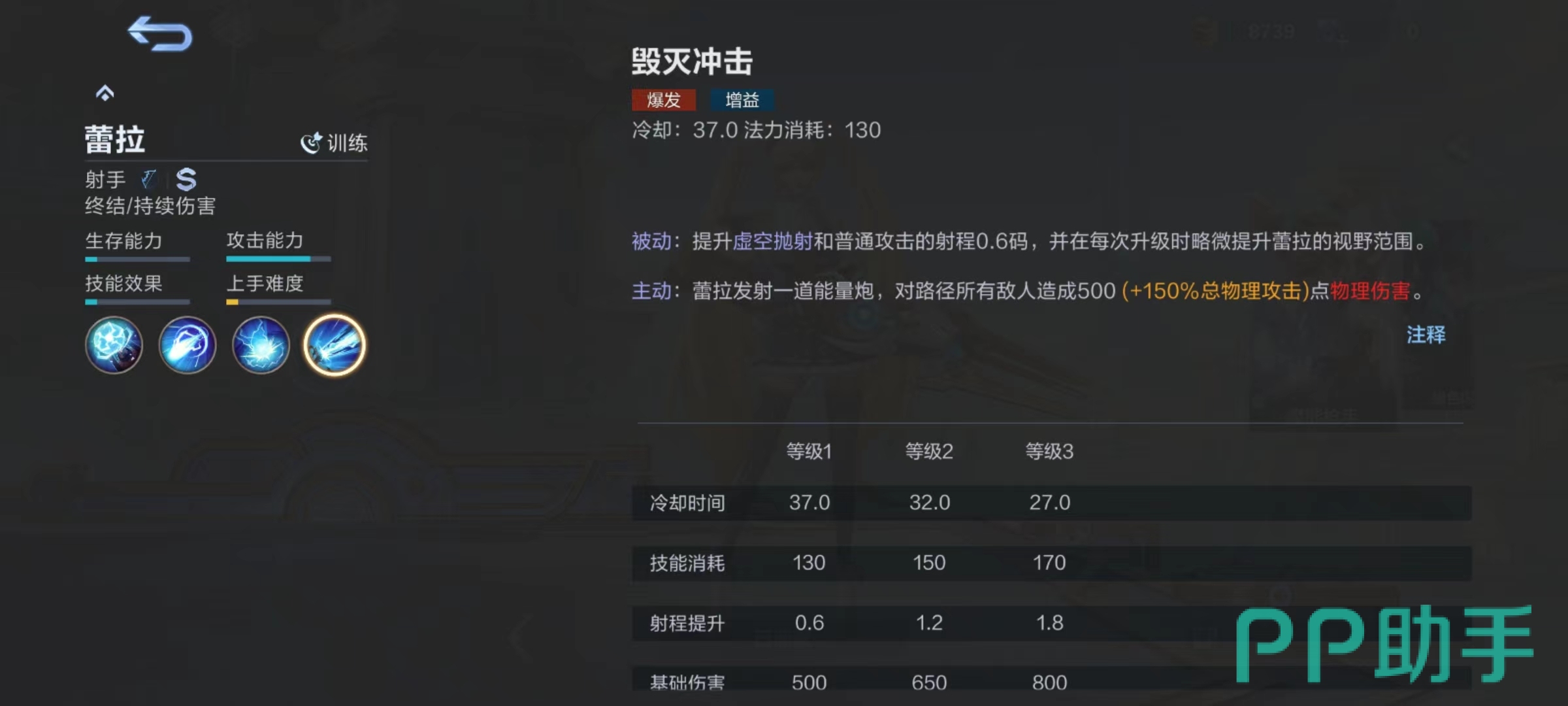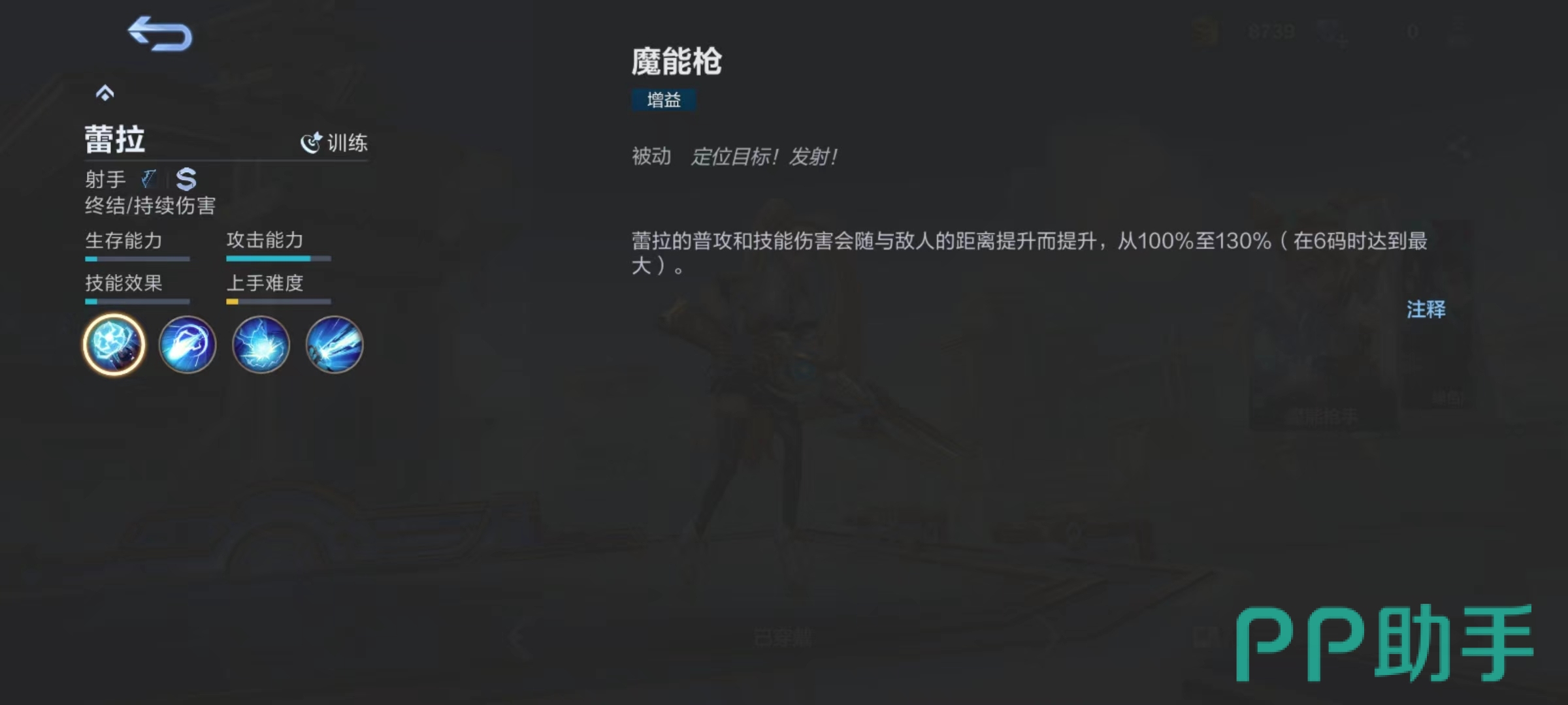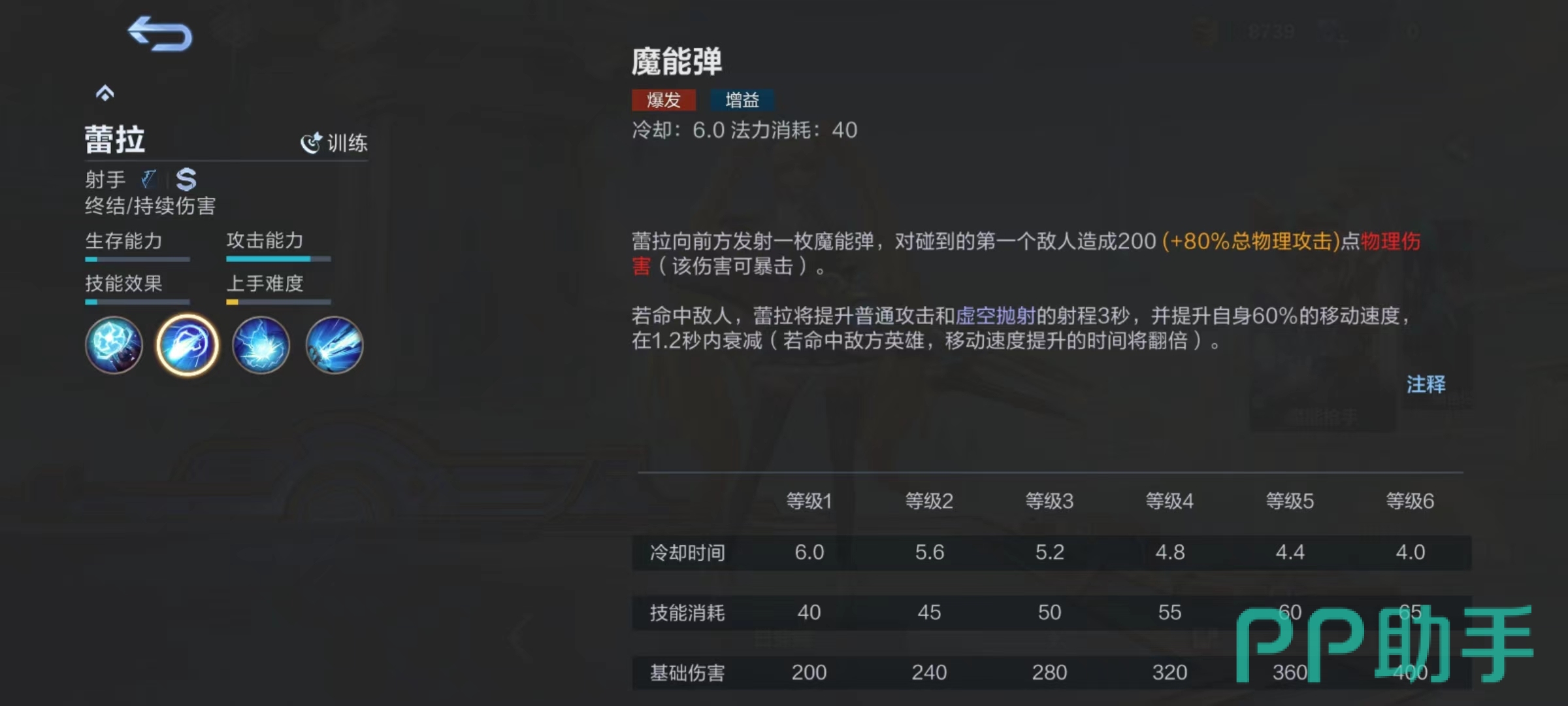 被动技能魔能枪,使蕾拉普攻和技能伤害会随着与敌人距离提升而随之提高,从100%~130%进行波动。所以在输出时候尽量注意自身走位和位置,能拉开距离就能够享受到更多加成,尤其是释放伤害比较出色的技能时更是如此。一技能魔能弹,向前方发射魔能弹,对碰到的第1个敌人造成物理伤害,并且能享受到暴击加成。如果成功命中敌人,蕾拉将提升普通攻击和虚空抛射射程,同时自身提高移动速度。
