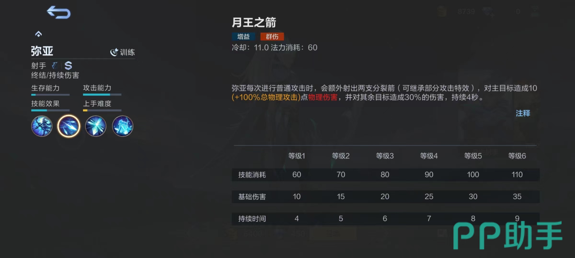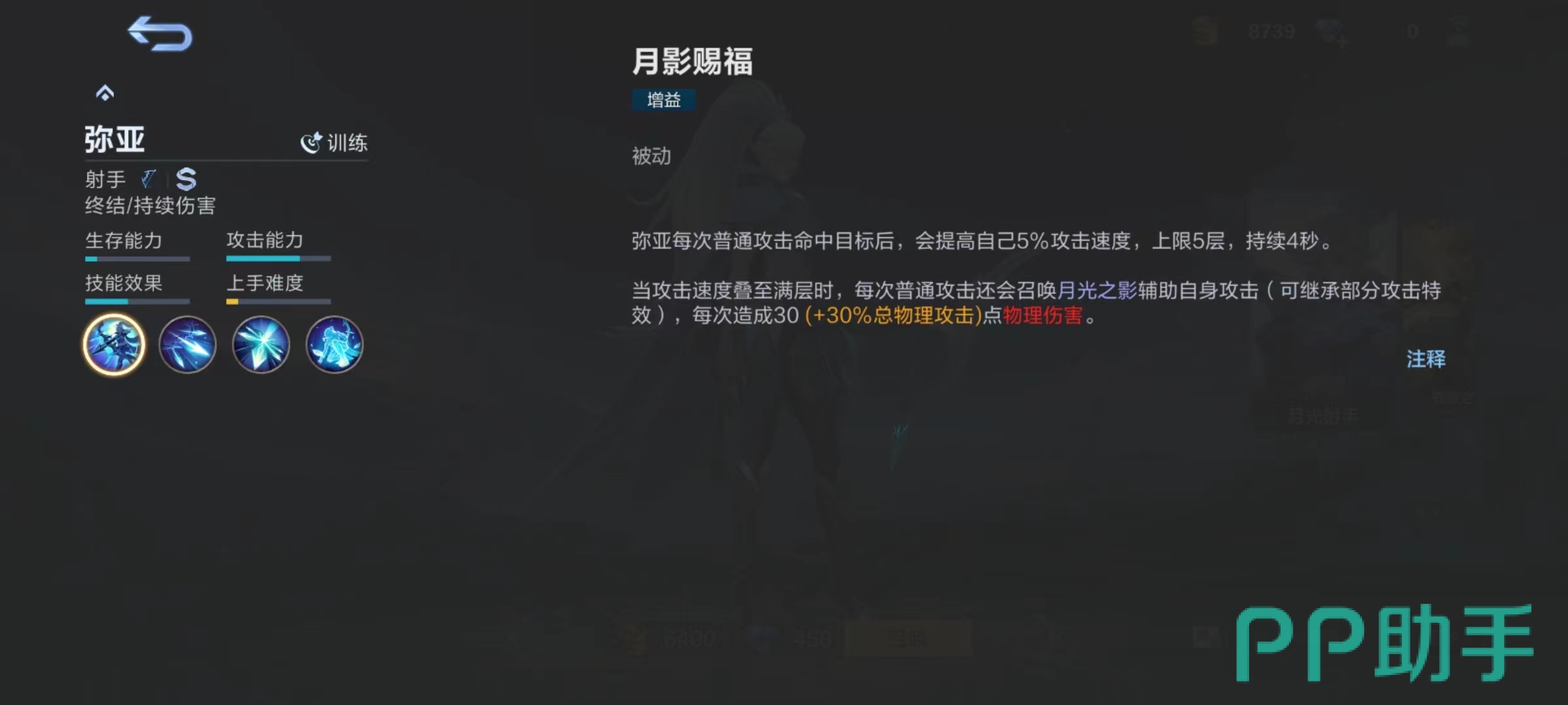 被动技能月影赐福,弥亚每次攻击命中目标后都会提高自身5%攻击速度,上限五层,也就是达到25%加成。当攻速叠加到满层时,普通攻击就会召唤出月光之影辅助输出,月光之影能继承部分攻击特效,虽然每次造成伤害并不高,但如果攻击特效给力,也是能有着意想不到效果。所以该进该角色在日常中就是不断保持自己输出频率,让身上的层数始终处于满层,这样能够持续享受加成。