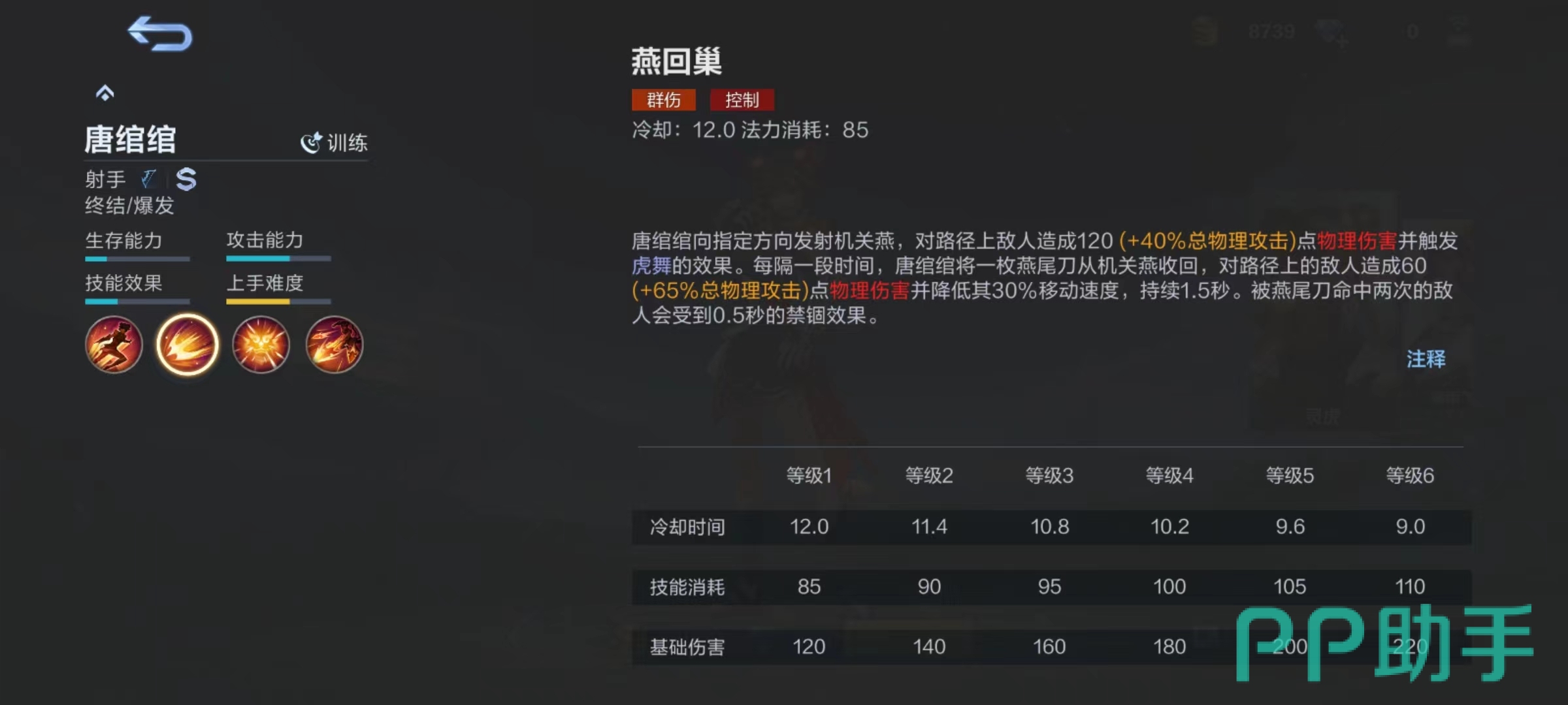 一技能燕回巢,向指定方向发射机关燕,伤害路径上敌人后触发被动虎舞效果,每隔一段时间就会将一枚燕尾刀从机关中收回,对路径上敌人造成伤害并降低移动速度。如果被燕尾刀命中两次的敌人将受到禁锢效果,要注意收回刀的时候是逐个收回,并不是一次性爆发,所以要考虑到对方位置以及自己站位,尽量能触发两次伤害。这样带来的禁锢可以方便继续爆发式输出,该技能能否成功命中目标也是考验使用熟练度的重要标准。