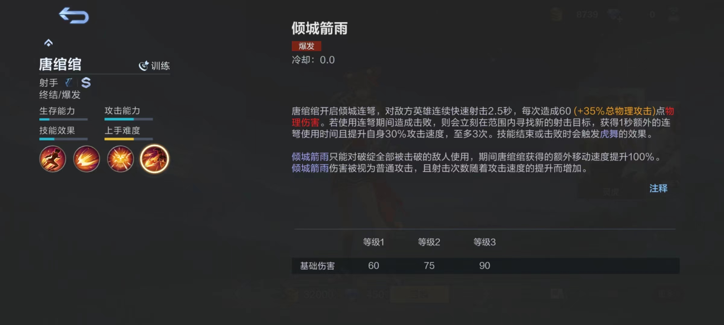 大招倾城箭雨,开启连弩后对敌方英雄进行连续射击,持续2.5秒,在使用连弩期间如果成功击败对手,则立刻在攻击范围内寻找新输出目标,获得一秒钟额外连弩使用时间,并且提高自身30%攻击速度,最多能转移三次目标。当技能结束或者是成功击败时,触发虎舞效果。另外该技能只能对破绽全部被击破的敌人使用,在此期间额外移动速度大幅提升,该技能伤害只会被视为普通攻击,射击次数随着攻击速度增加而增加。