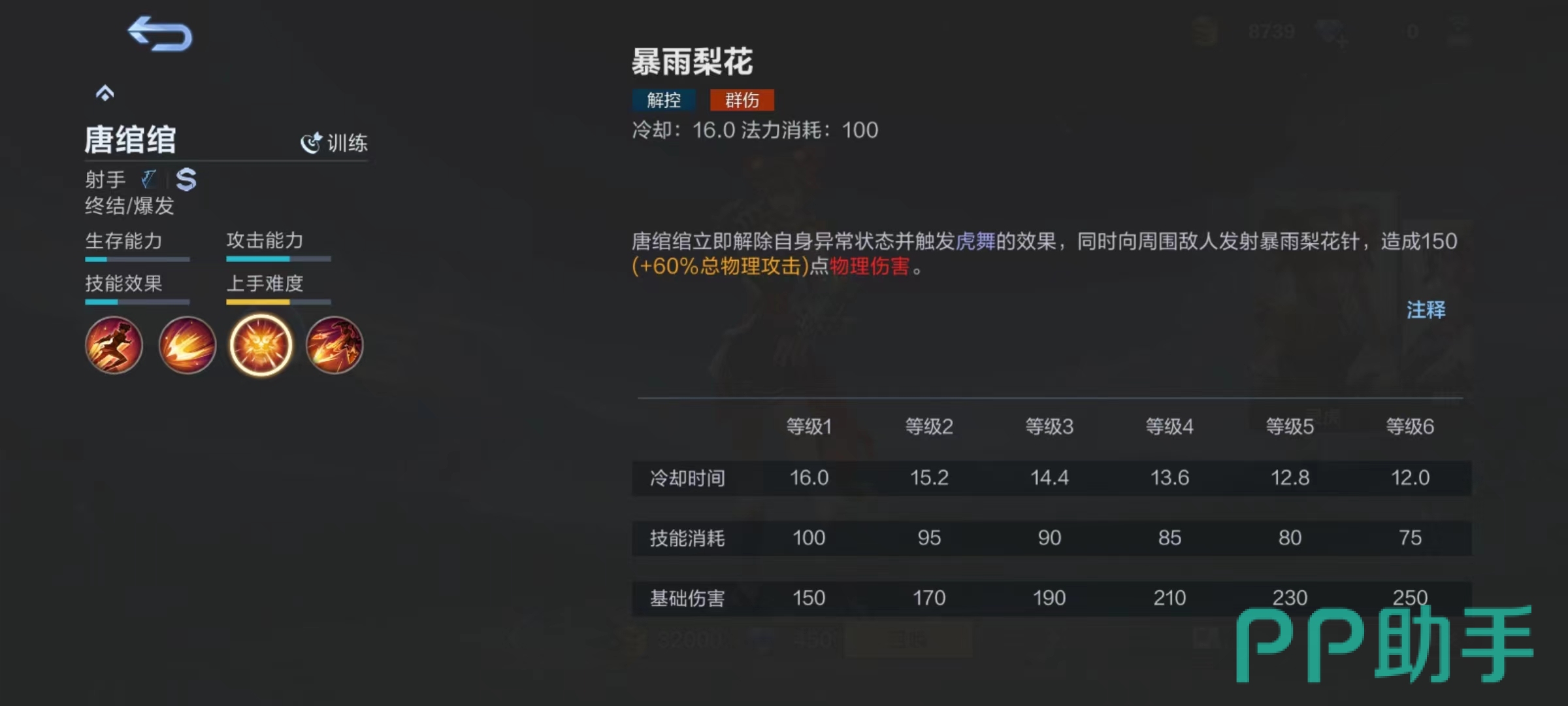 二技能暴雨梨花,立即将身上所有异常状态解除并触发被动虎舞效果,向周围敌人发射暴雨梨花针,造成群体伤害。一旦对方想近身控制住,就可以直接利用此技能解除,这对于重视机动性的射手来说是非常关键的,因为灵虎唐绾绾非常脆弱,如果被对方控住不能及时解开,很容易就被直接秒杀掉,尤其是面对战士和奇袭这样的高爆发角色更是如此。所以该技能一定要捏在手里不能轻易使用,很多高手都会盯着技能CD出手,一旦发现我们将解控技能使用掉了,就会直接出手。