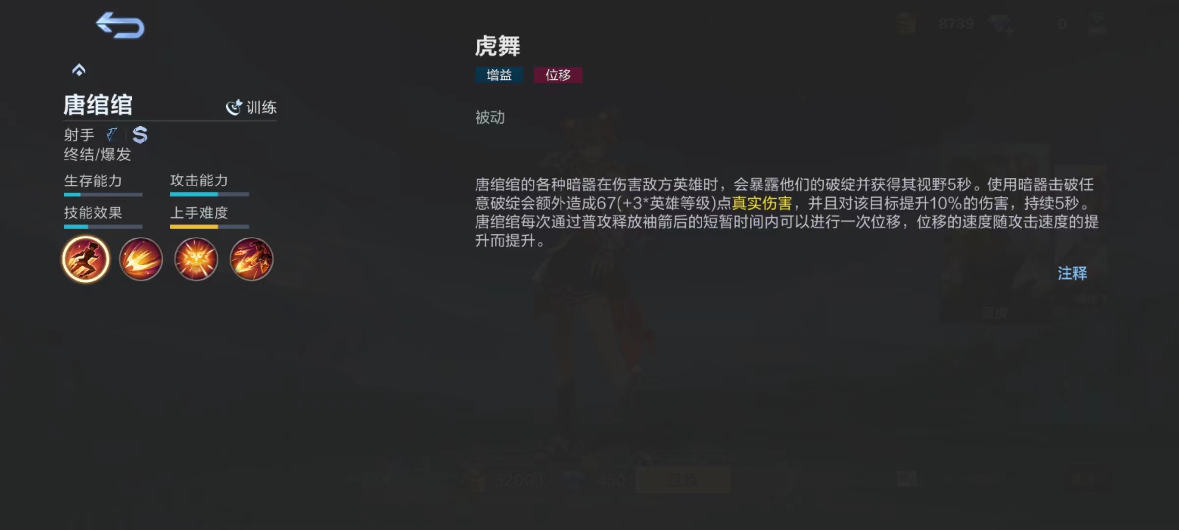 被动技能虎舞,唐绾绾各种暗器在伤害到敌方英雄时都会将他们破绽暴露出来,获得对方视野,使用暗器将破绽击破会造成额外真实伤害,并且对目标提升10%,伤害持续5秒钟。每次通过普攻释放袖箭后,都会短时间内进行一次位移,位移速度随攻击速度提升而提升。有了这样的被动,就能够成为一名机动性极高的射手,就如同滑板鞋一样,每次普攻之后都可以快速位移,让对方难以追上。有了这样效果甚至可以在极限情况下风筝对手创造奇迹,这也是很多高手玩家都选择使用的重要原因。