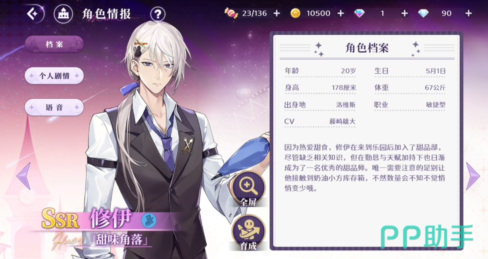 修伊是出生在洛维斯的一名甜点师,生日是5月1日,现在年龄20岁,身高178厘米,体重67公斤。修伊特别喜欢甜食,所以他在来到乐园之后毫不犹豫就加入了甜品部,即使就连对甜品的基础知识也有缺乏,他也凭借自己的天分与勤奋成为了一名优秀的甜品师,对甜品有着独特理解的他做出的甜品非常好吃。