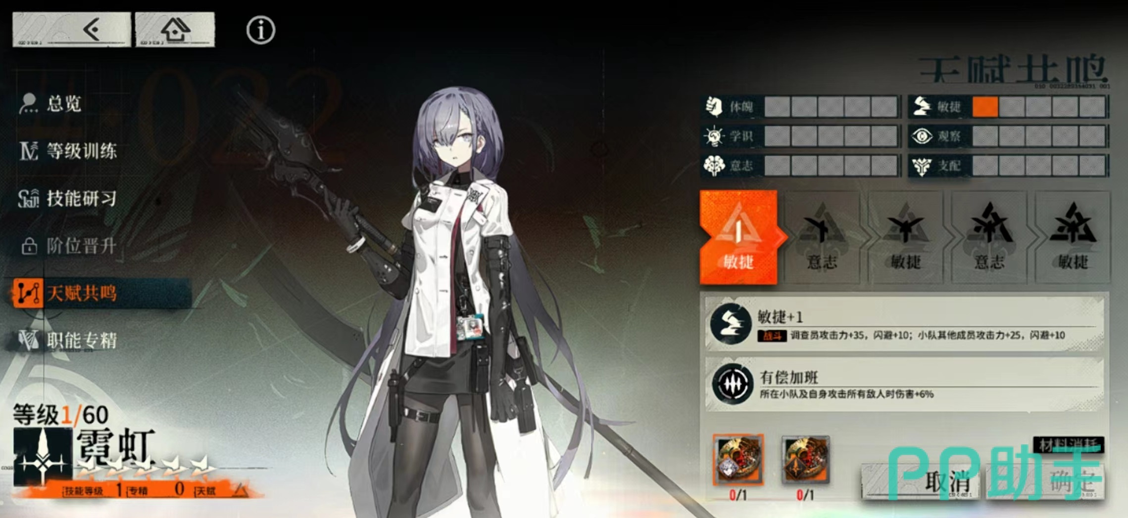 自身被动迭代,在战斗状态下时,周围一格友军在十秒内内攻击逐步提高,最多能提升到25%。如果离开该范围则失去强化效果,这样只要围绕在霓虹周围就能一直享受,对于输出来说是比较关键的。最后是该角色所具有的天赋共鸣,主要包括有偿加班,敏捷和意志三项内容,有偿加班可以使自身以及所在小队所有成员在攻击敌人时造成伤害提升。