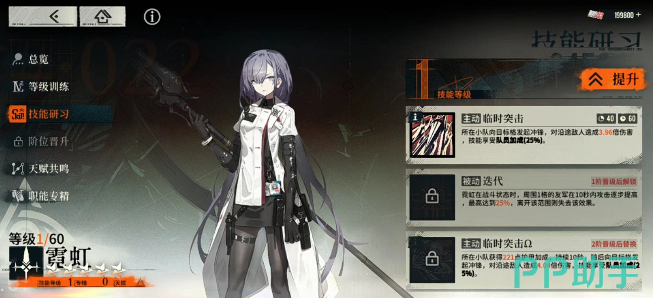 该角色同样属于初始五星,所以属性方面绝对不用担心,要了解的只是主动和被动技能效果,为了更好使用。游戏中的霓虹属于调查团阵营,自身在技术部门工作,之前在梭罗生命科技作为研究员,因为拥有很好数据整理能力和丰富护卫经验,所以才分配制研发部工作,主动技能,临时突击,在最初阶段可以和小队所有成员一起向选定目标格发动冲锋,对沿途所接触到敌人造成高额伤害,此技能还能享受队员加成。