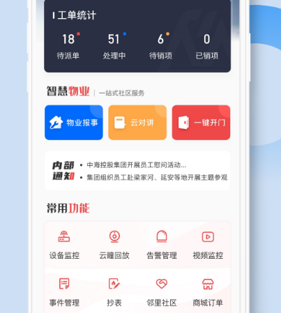 作为应用于物业公司,移动化办公软件,有设备监控,报事报修等各种核心内容,让物业工作人员在最短的时间内快速的完成工作并进行统筹工作,提高物业公司的整体工作效率及管理模式,让管理层更加便捷,让工作人士服务时更加高效,更加方便。