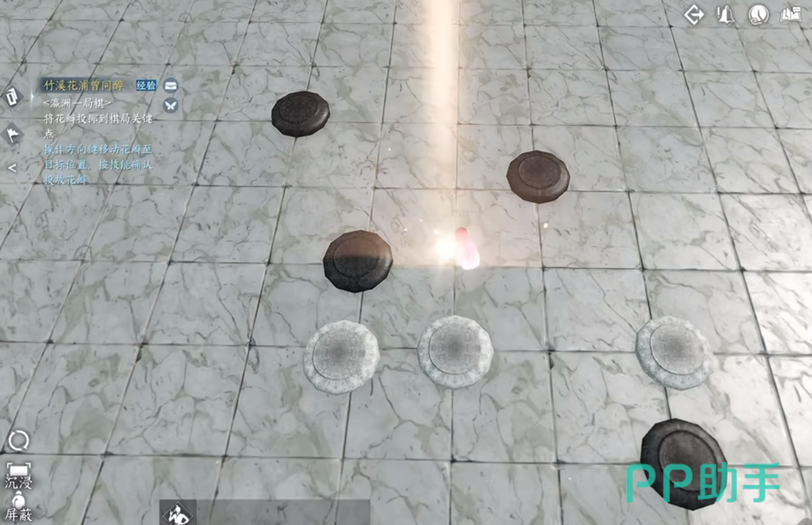 玩家上岸后,看到老人在地面上摆出一个棋盘,任务要求玩家将花瓣投掷到棋盘关键点。这里移动方向盘就可以控制花瓣的目标位置,然后按技能确认键投放花瓣。这里j即使是不懂围棋玩法也没关系,关键位置有金色光点提示,玩家移花瓣到最中央十字位置,点击投放即可触发剧情cg。