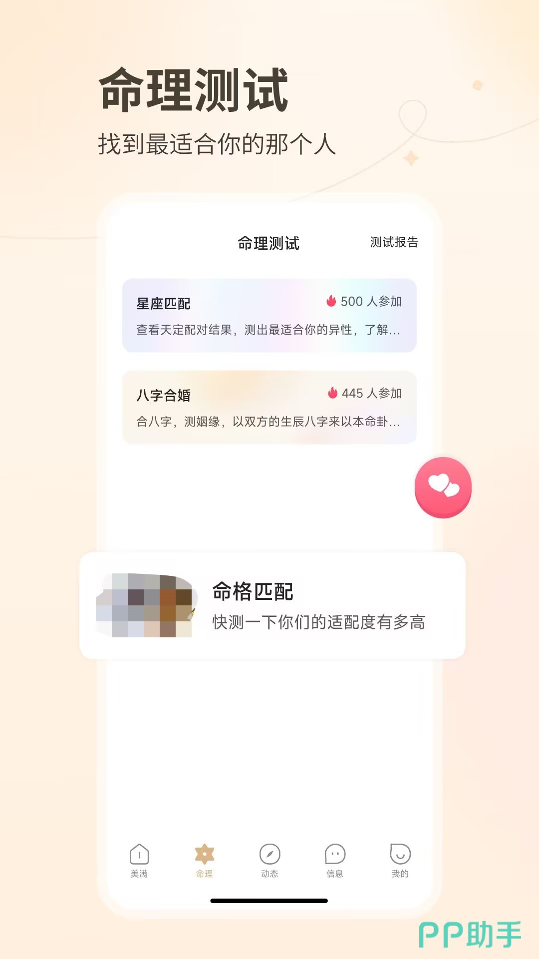 美满婚姻,说到匹配程度那么肯定要提一下这款APP,因为上面提供了非常先进的命理测试和星座测试来查看情侣们的天定异性配对结果,也可以看看八字合理情况,只需要两对情侣,用户们分别输入一下自己出生年月日和时间就可以非常快速的看看八字是否匹配和匹配等等,并且还有一些非常有意思的星座,性格方面测试来了解,深入了解一下对方的情怀的呢。