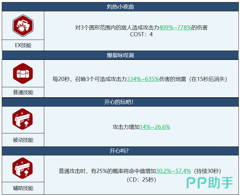 她的技能有以下几个特点:EX技名曰灼热的小夜曲。开启后可以对多个大跨径aoe内的敌人造成持续输出,如果这一些aoe区域有重合的区域的话,伤害还可以再次叠加。这个技能的释放范围非常不错,甚至能直接打到后排敌人,而且伤害倍率很高,也是睦月最强的技能。普通名叫爆裂的咏叹调。睦月每20秒可以设置三个地雷,每个地雷在15秒后消失。每个地雷都是单独计算伤害的,而且可以暴击。但是这个技能的缺点是地雷丢得比较靠前,不容易打到敌人,需要一些角色配合才能发挥效果。被动技:来尽情玩耍吧!和要去找点乐子吗?这两个被动技能都可以增加睦月的攻击力和命中值,提高她的输出能力。