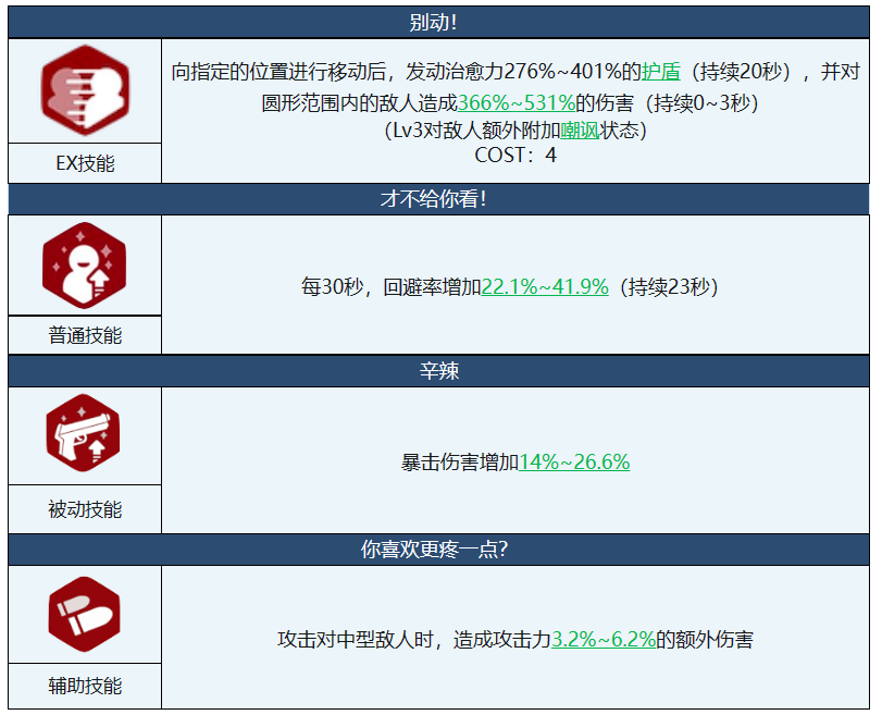 首先,妮露兔女郎是一位气前排角色,也就是说她需要靠近敌人才能发挥作用。这样的角色通常需要有较高的生存能力,而妮露兔女郎正好拥有这样的优势。她的护盾可以有效地减少受到的伤害,而且她还有2000多点的防御和回避,这使得她很难被击倒。即使她受到了致命的攻击,她也有一定几率触发自我复活的被动技能,让她重新回到战场。